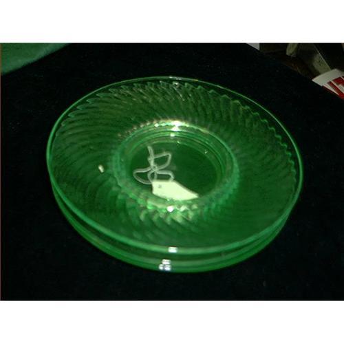 This is a real nice old set of green depression plates, with a swirl pattern and they are 8" Diam. They are a set of 5, but 3 have the swirl going to the left and 3 same pattern, but swirl going to the right. Perfect condition as we said and they are old and a great add to any collection you may have. Great gift item also. Hope you like them.