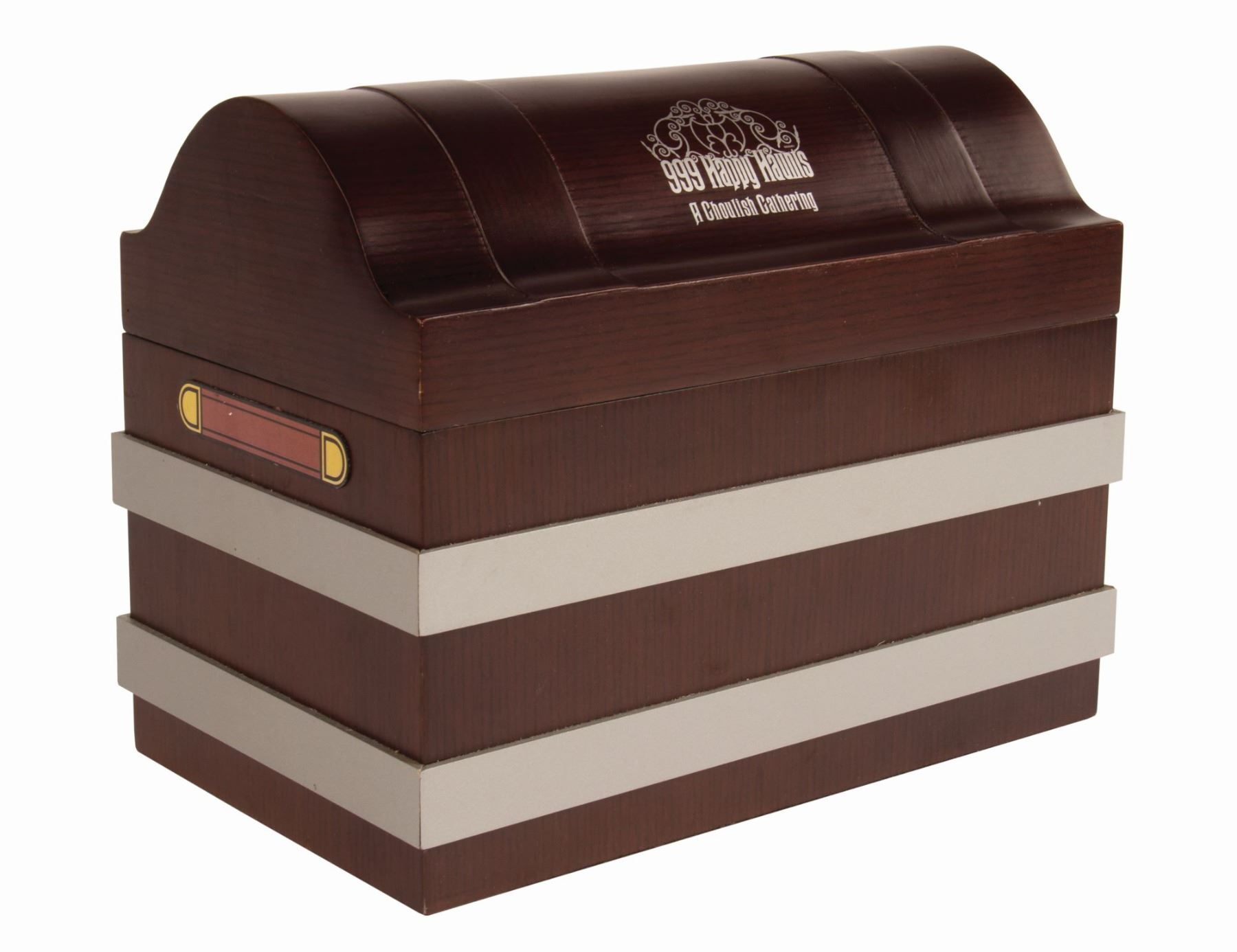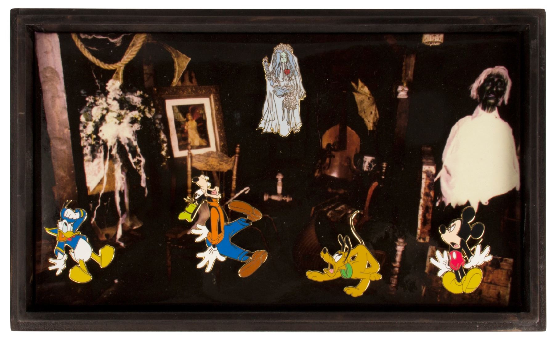 (Walt Disney World, 2004) A limited edition boxed set of (5) pins based on the Haunted Mansion. The pins depict Mickey and friends frightened to see the ghost bride in the attic of the Mansion, and the pins are contained within a chest-shaped box with removable lid. Created in a limited edition of only 350 pieces for the 999 Happy Haunts event, these pins range in size from 1.5" to 2" tall. The chest measures 6.25"x10.25" and 8" tall and is in good condition overall with some wear to the surface from previous display.