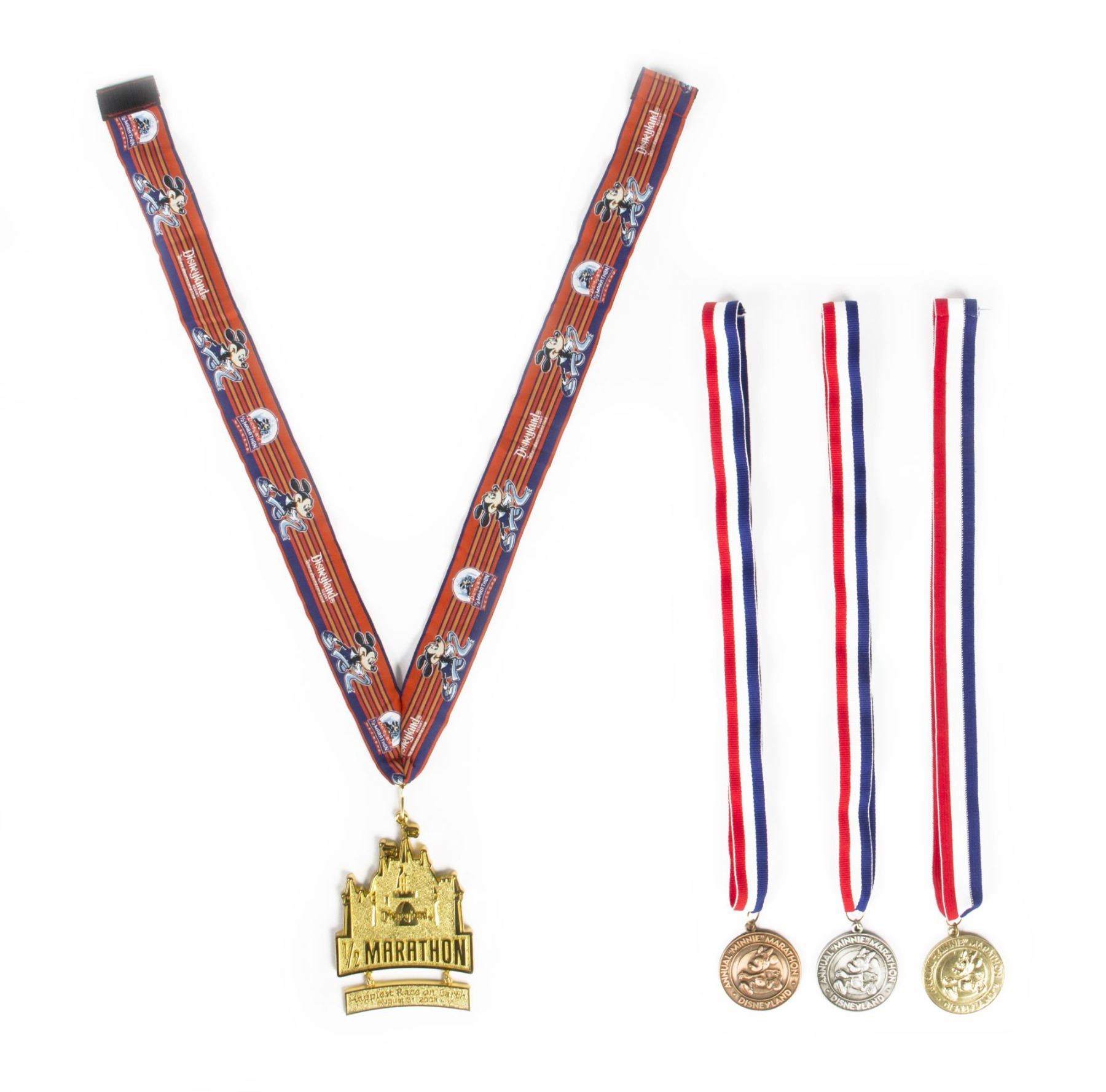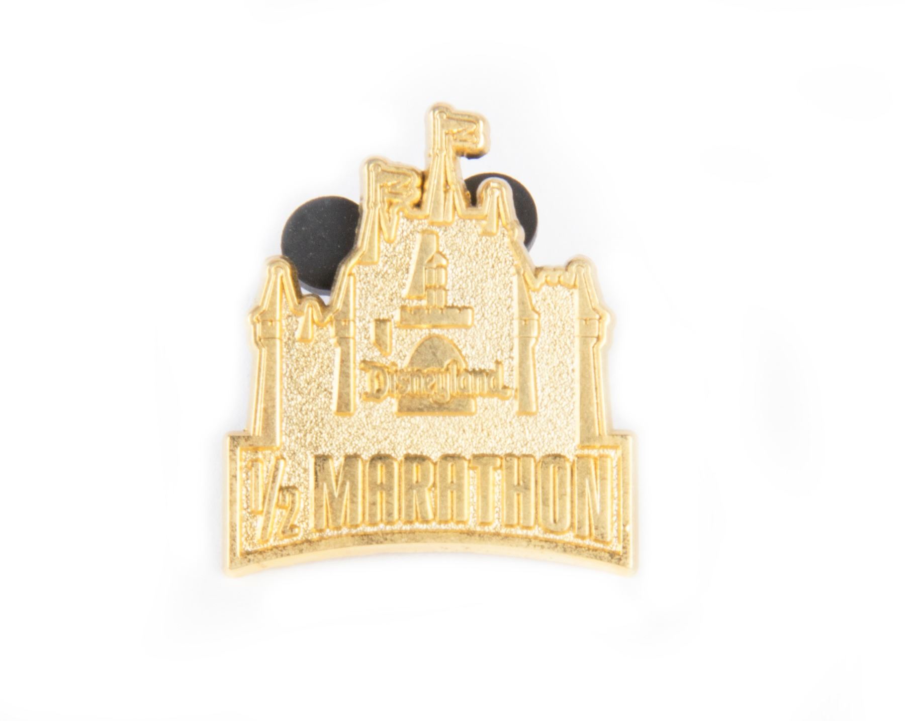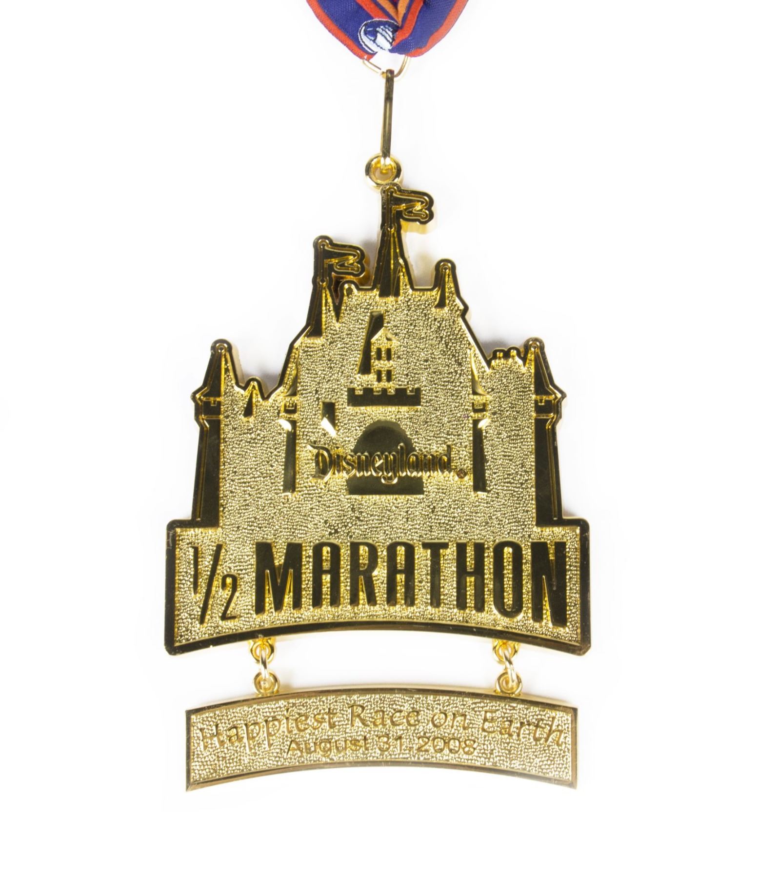 (Disneyland, 2000s) A collection of (5) medals and a pin from several marathons at Disneyland. The collection includes two large medals from the Disneyland 1/2 Marathon in 2007 and 2008, a set of gold, silver, and bronze medals from the Annual "Minnie" Marathon, and a pin from a Disneyland 1/2 Marathon. The medals feature Sleeping Beauty Castle and Minnie Mouse, and measure 5"x3.25" and 2"x2" respectively. The condition is very good throughout with minor wear.