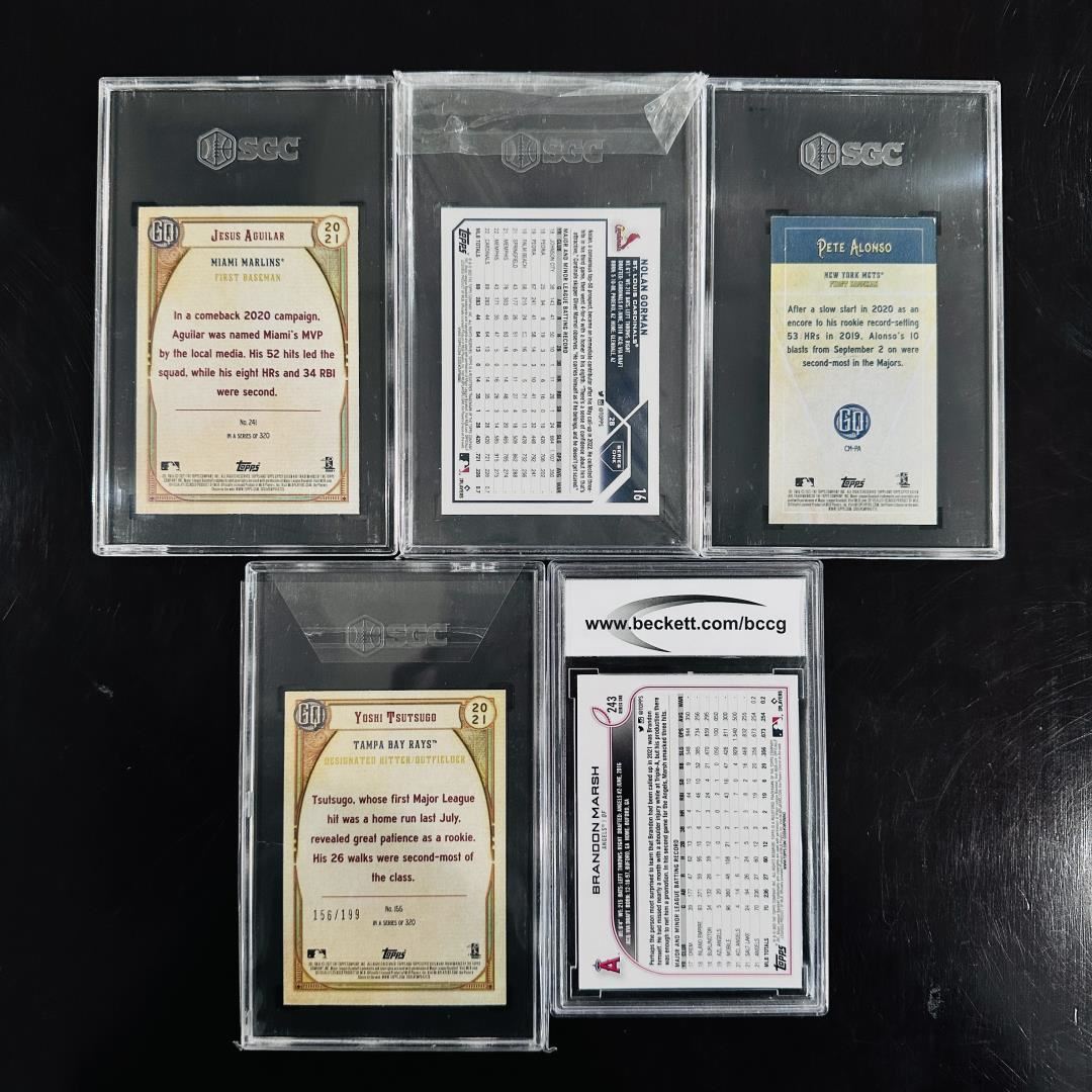 This five-card lot includes graded modern baseball stars and rookies, highlighted by standout slabs like a 2022 Topps Nolan Gorman RC graded SGC 9.5 and a 2021 Gypsy Queen Yoshi Tsutsugo Turquoise parallel /199 graded SGC 10. Other names include Pete Alonso (Captain Mini), Jesus Sanchez (Nameplate), and a 2022 Brandon Marsh RC graded BCCG 10. A solid value set for collectors of today's rising talent.