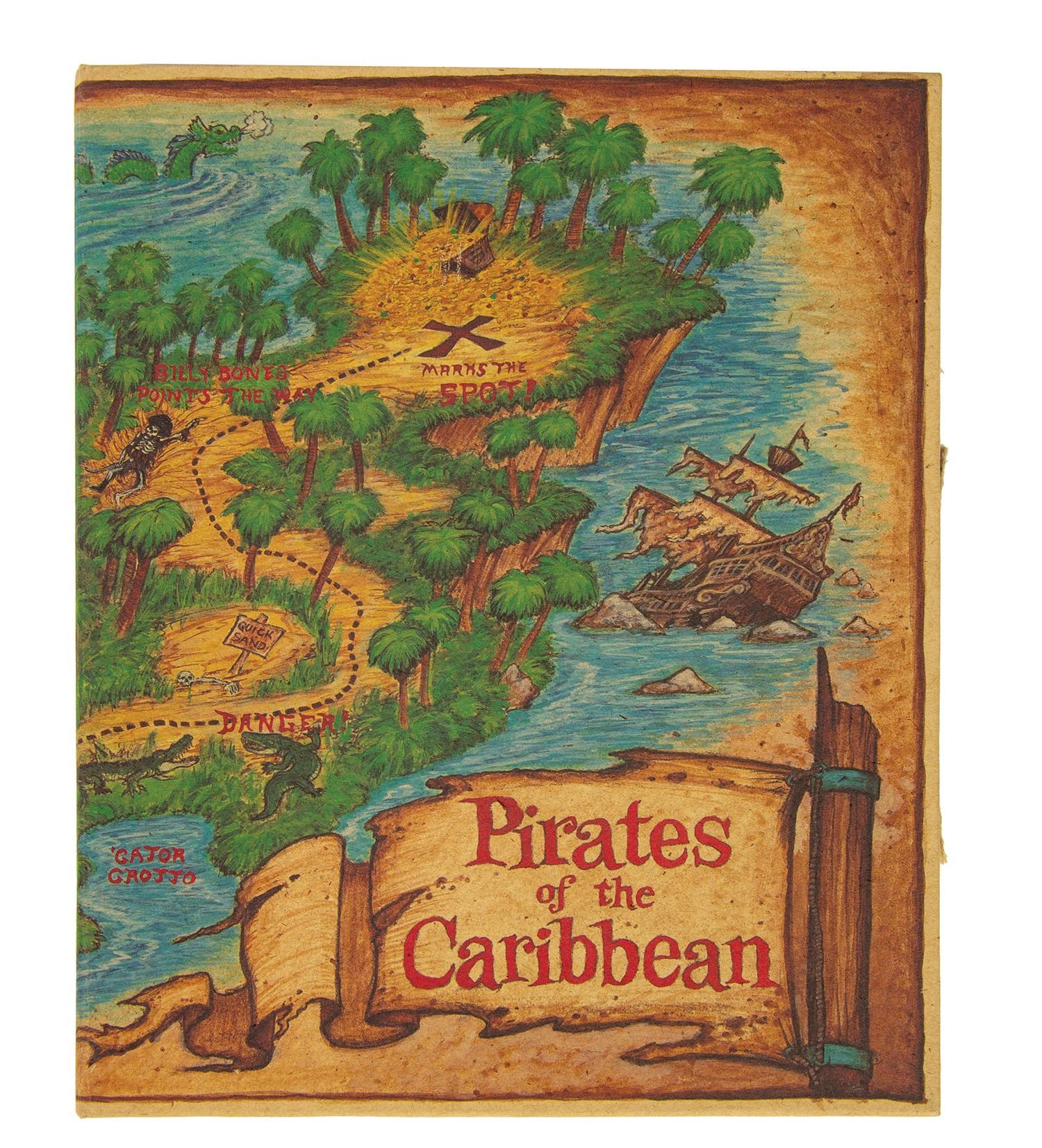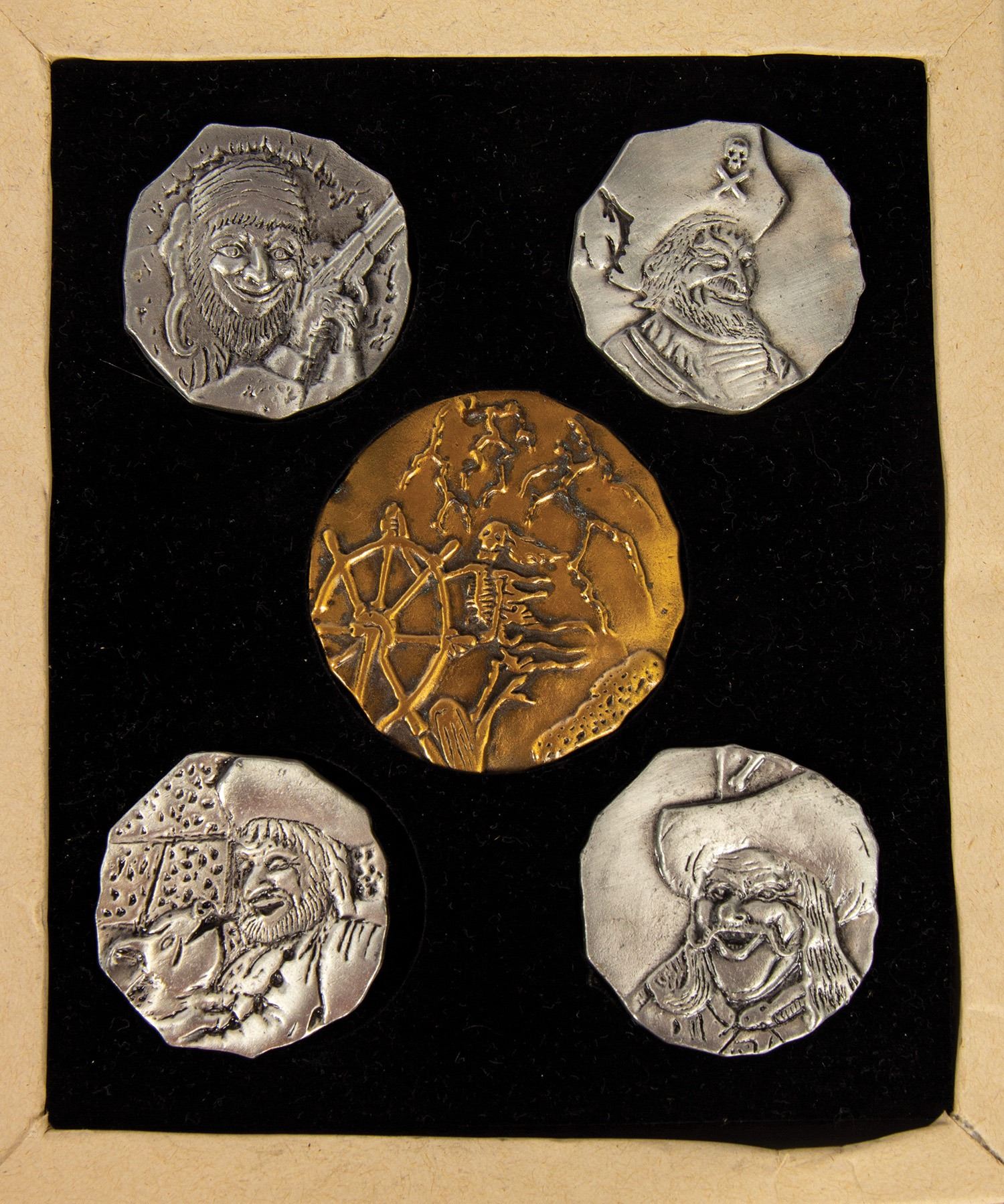 (Disneyland, 2000) A limited edition boxed set of (5) coins from a special Pirates of the Caribbean event at Disneyland on May 20, 2000. The metal coins feature imagery of notable scenes and characters from the attraction. The set was created in an edition of 1000 pieces and comes in a treasure map box. The coins range in size from 1.75" to 2.25" in diameter. The condition is very good.