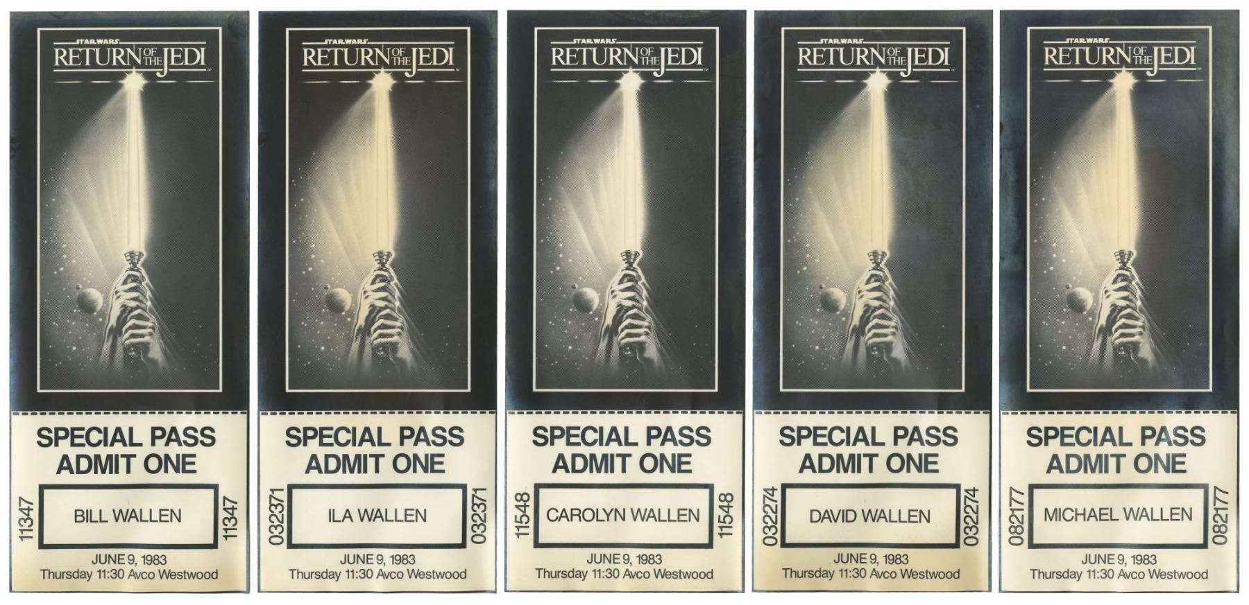 (20th Century Fox, 1983) A rare collection of (5) special admission passes to an original viewing event for "Return of the Jedi" on June 9, 1983. These passes come from the personal collection of Bill Wallen, who helped develop promotional and advertising campaigns for the film, and below the recreated poster artwork on each admission pass, the names of Bill and his guests are printed along the bottom of each pass. The event was held at 11:30 at the Avco Westwood Theatre, and these large passes measure 10.5"x4.5". The condition is fair to good, with some minor discoloration and a waviness to the paper from use.