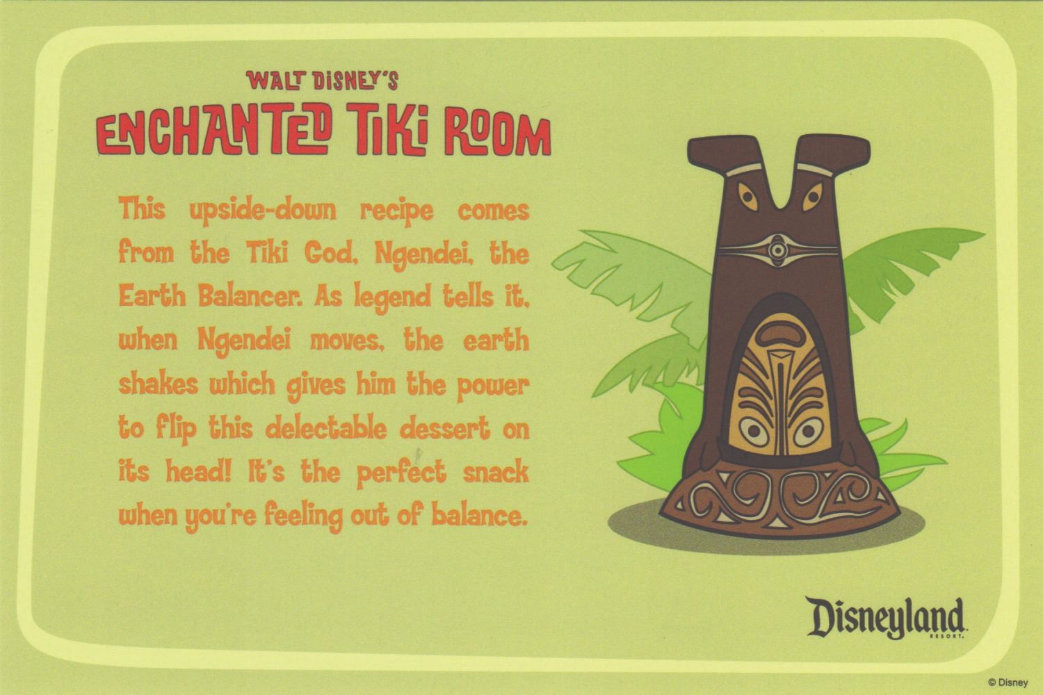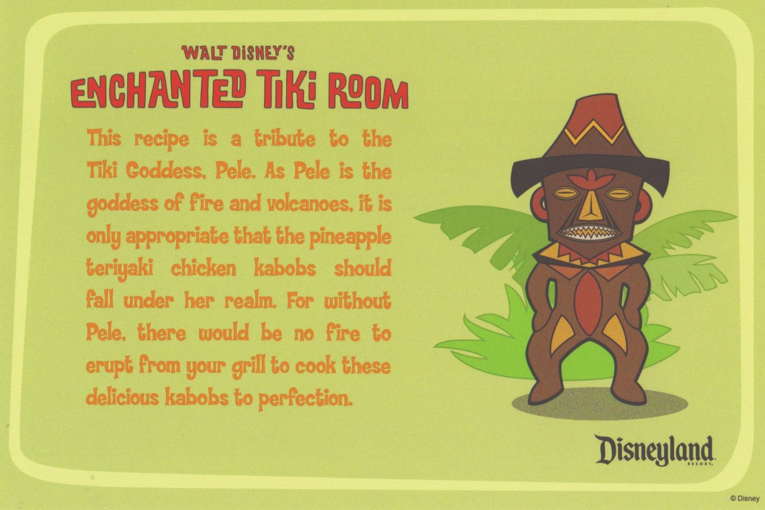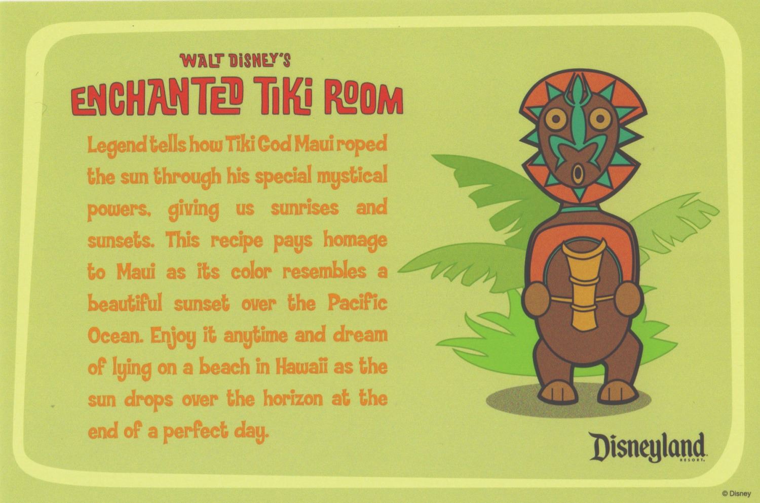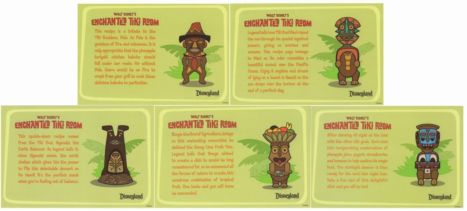 (Disneyland, 2010) A complete collection of (5) Enchanted Tiki Room recipe cards created by Dole to celebrate the renewal of their sponsorship of the attraction. Each card features one of the gods seen in the courtyard of the Enchanted Tiki Room and an explanation of why the recipe suits them on one side, and a pineapple-themed recipe on the reverse. Measuring 4"x6", the set is in fine condition with minor wear.