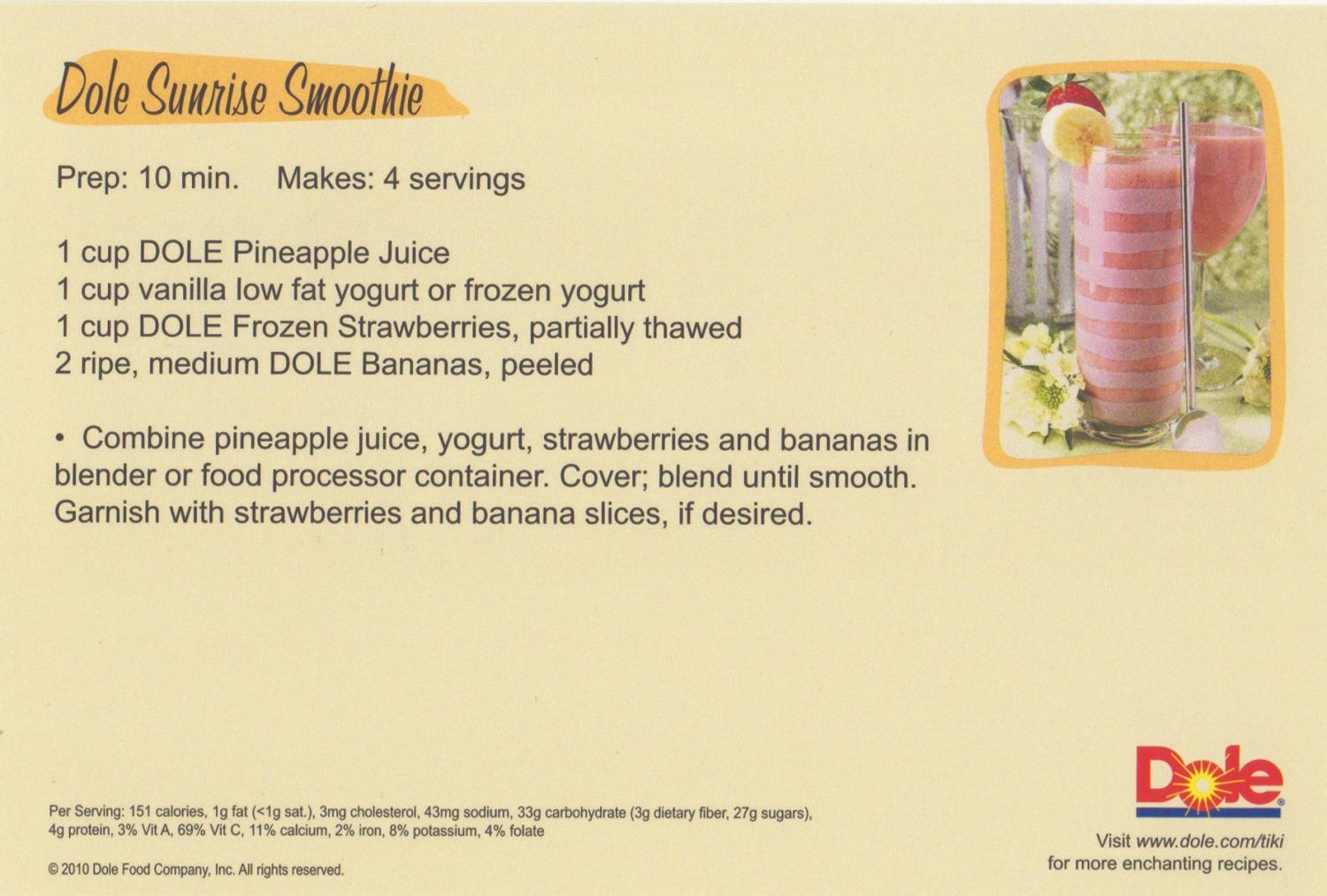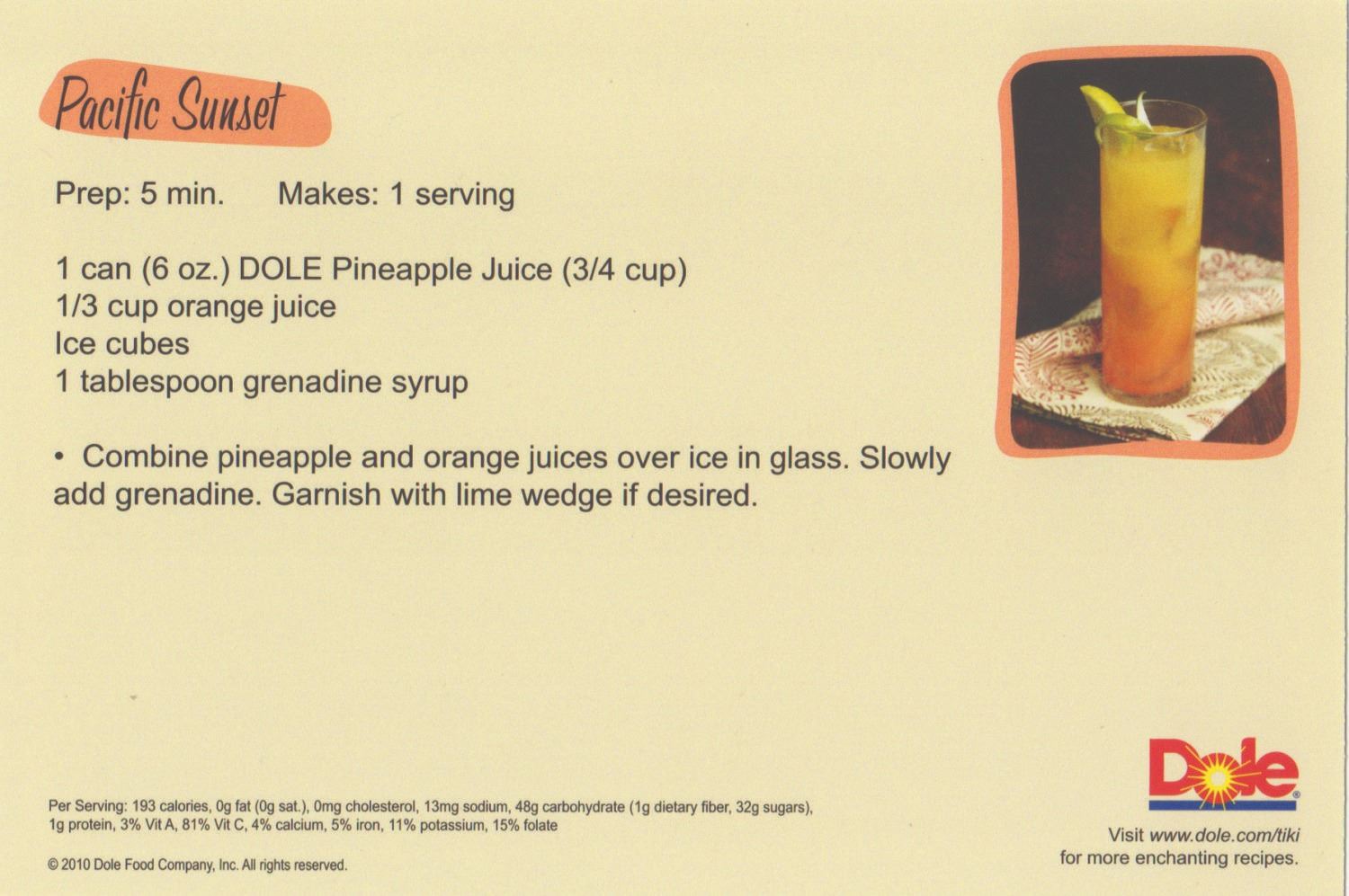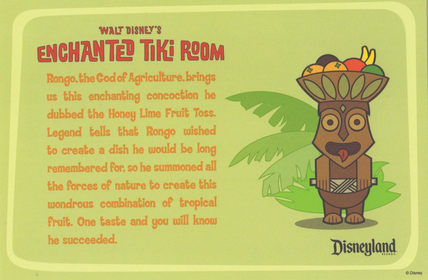 (Disneyland, 2010) A complete collection of (5) Enchanted Tiki Room recipe cards created by Dole to celebrate the renewal of their sponsorship of the attraction. Each card features one of the gods seen in the courtyard of the Enchanted Tiki Room and an explanation of why the recipe suits them on one side, and a pineapple-themed recipe on the reverse. Measuring 4"x6", the set is in fine condition with minor wear.