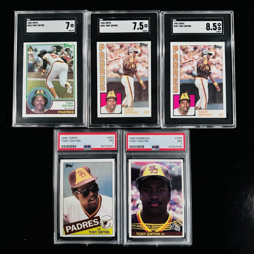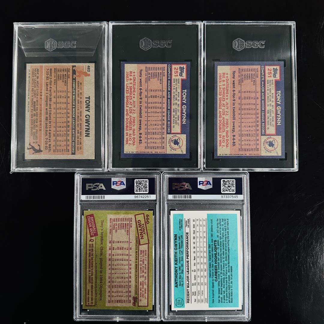 This five-card lot celebrates the legendary Hall of Famer Tony Gwynn, featuring key cards graded by both PSA and SGC. Included are a pair of 1989 Topps #251 cards in SGC slabs, a 1987 Donruss #488 (SGC), a 1989 Fleer #600 graded PSA 9, and a 1988 Topps Record Breaker #3 graded PSA 7. Each card highlights Gwynn's consistent excellence at the plate, with stats and writeups chronicling his dominant performances during the late '80s. A solid vintage-era grouping ideal for Padres fans or collectors building out a Gwynn-focused set.