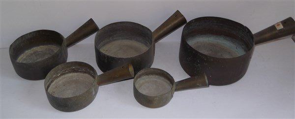 Set of 5 hand forged brass nesting pots. Used condition. Largest measures 12 inches x 8 inches x 4 1/4 inches; Smallest measures 7 inches x 4 inches x 2 inches.
