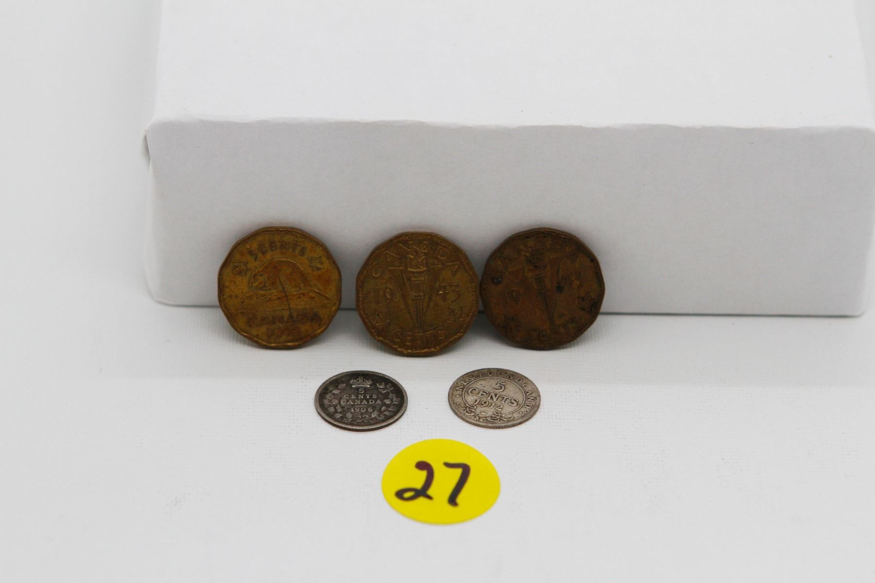Set of 5 nickels - 3 bronze nickels( 1942&1943) and 2 silver (1906&1912)
