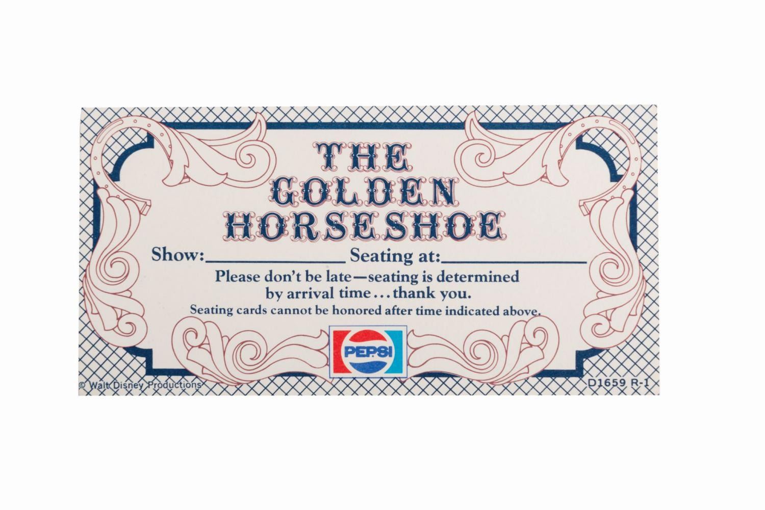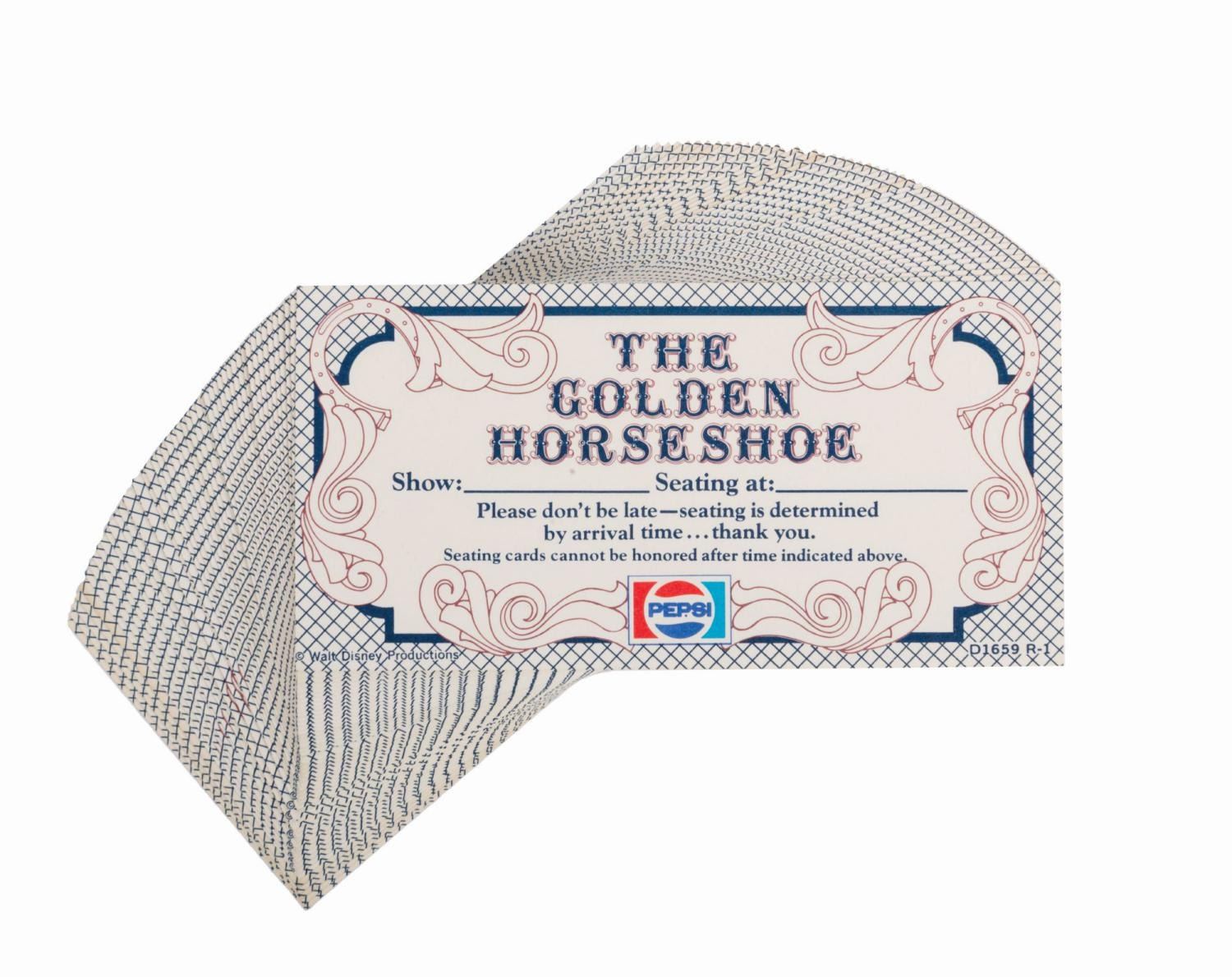 (Disneyland, c.1970s) A set of (50) unused Golden Horseshoe reservation cards. Measuring 2.5"x5", each card is printed on heavy textured stock, and features both the Walt Disney Productions copyright mark and the Pepsi Company logo. These ephemeral artifacts are a testament to the Partnership relationship between the two companies and the Golden Horseshoe Revue. The set is in very fine unused condition.