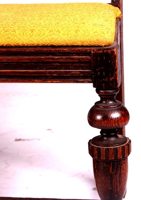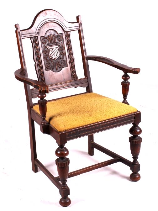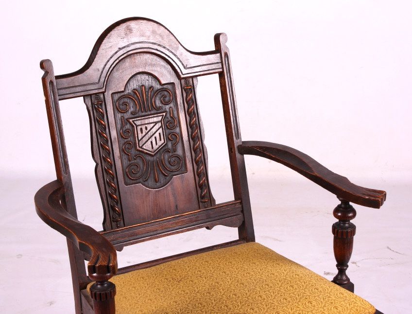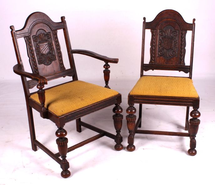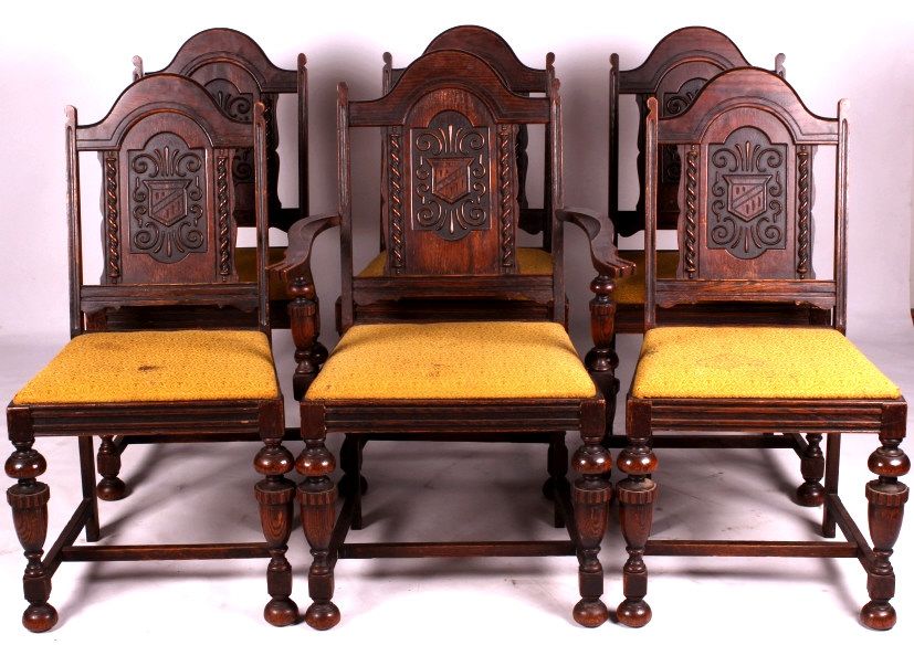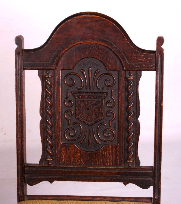 This is a set of 6 carved oak chairs. These chairs are circa 1920. They each have an upholstered seat. The backs of the chairs are carved. The chairs are in good condition. They measure 17" x 19" and are 37" tall.