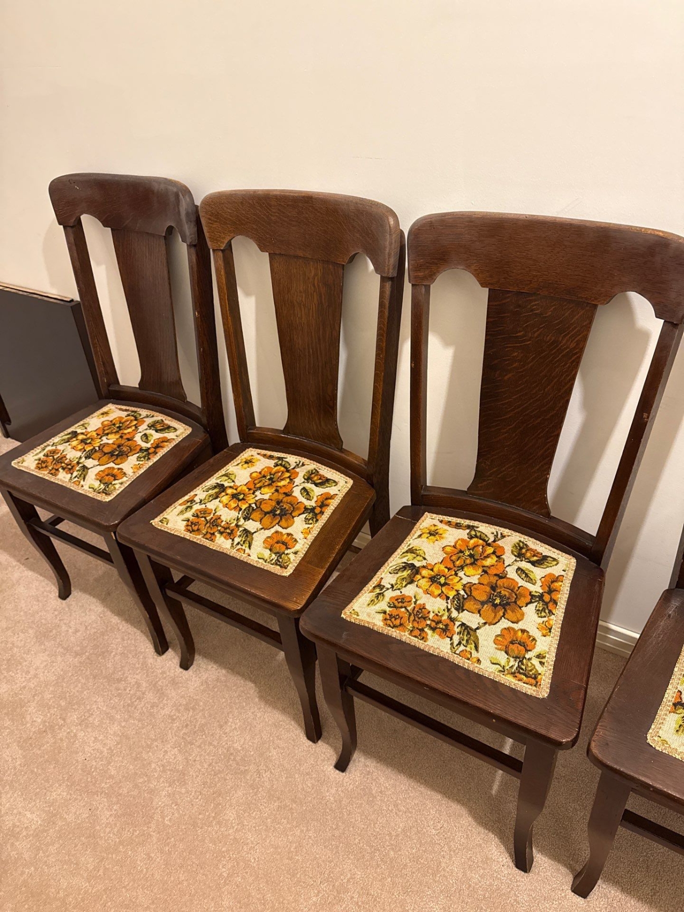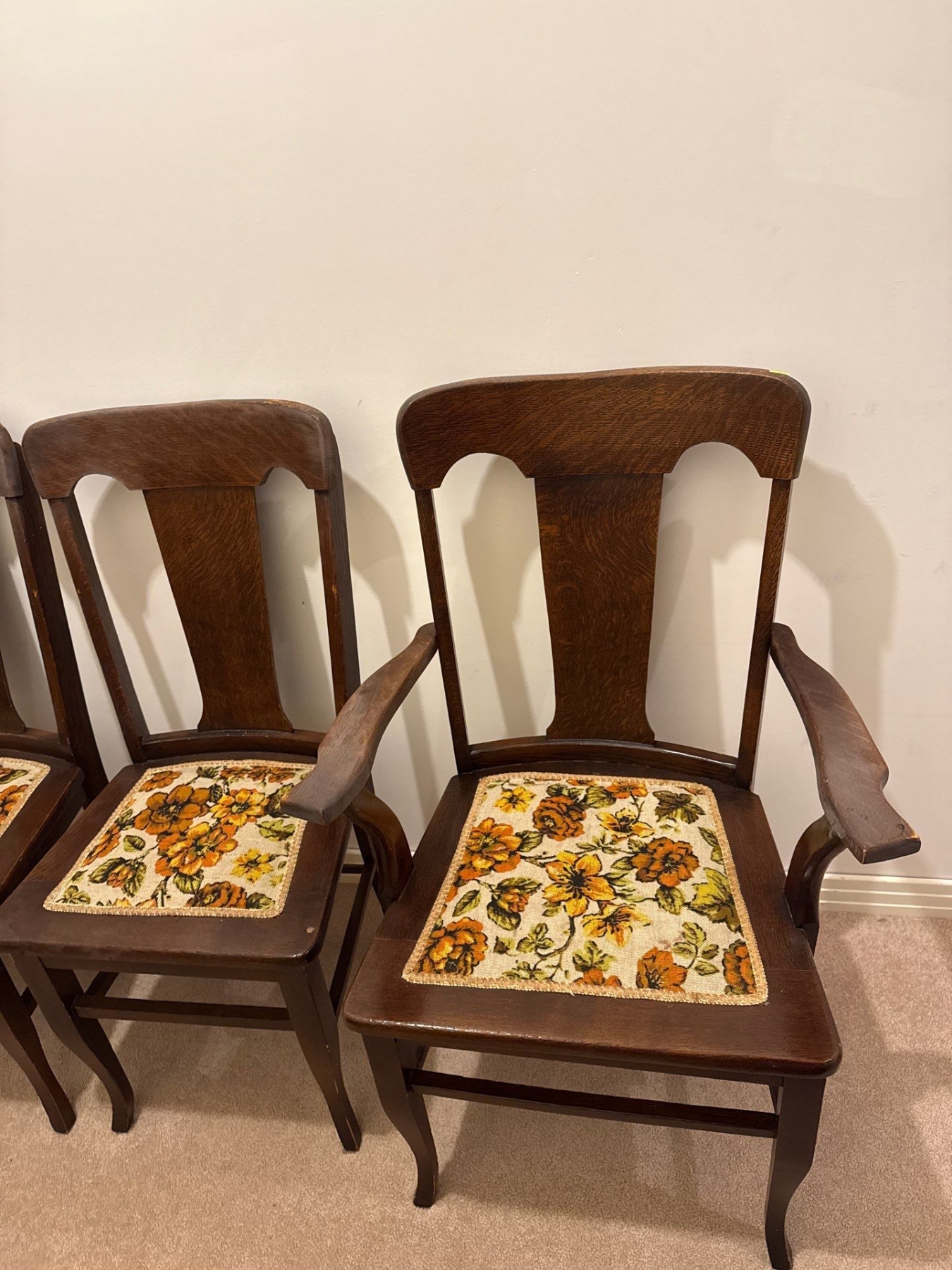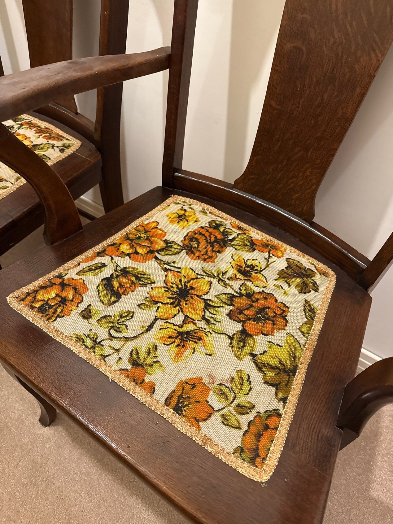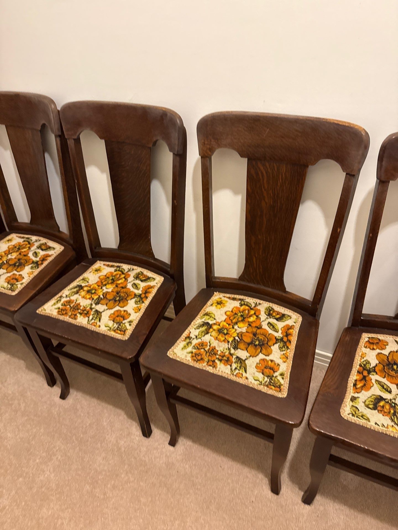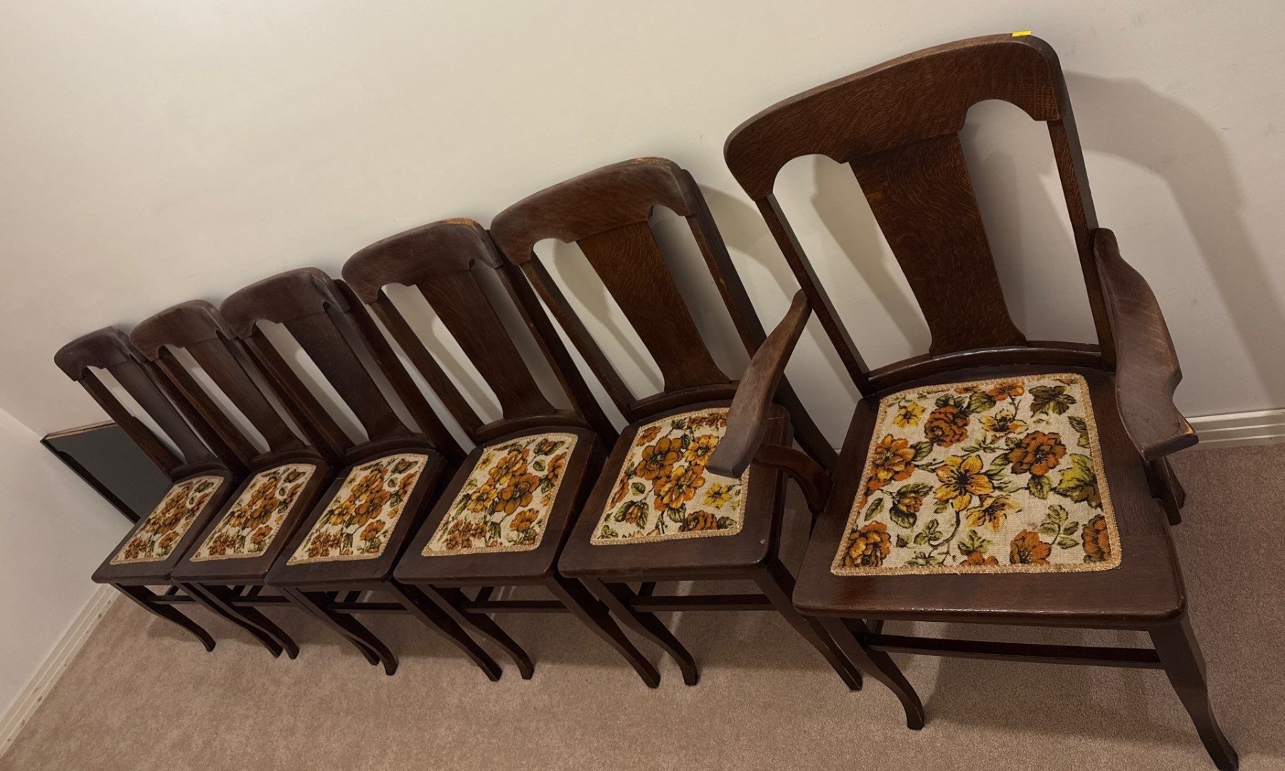 Set of 6 Antique Dining Table Chairs, Wood & Textile, 39In Tall
