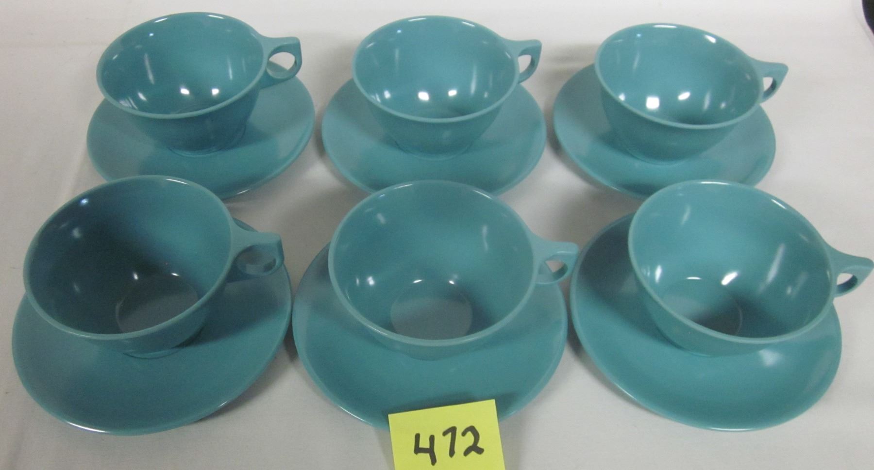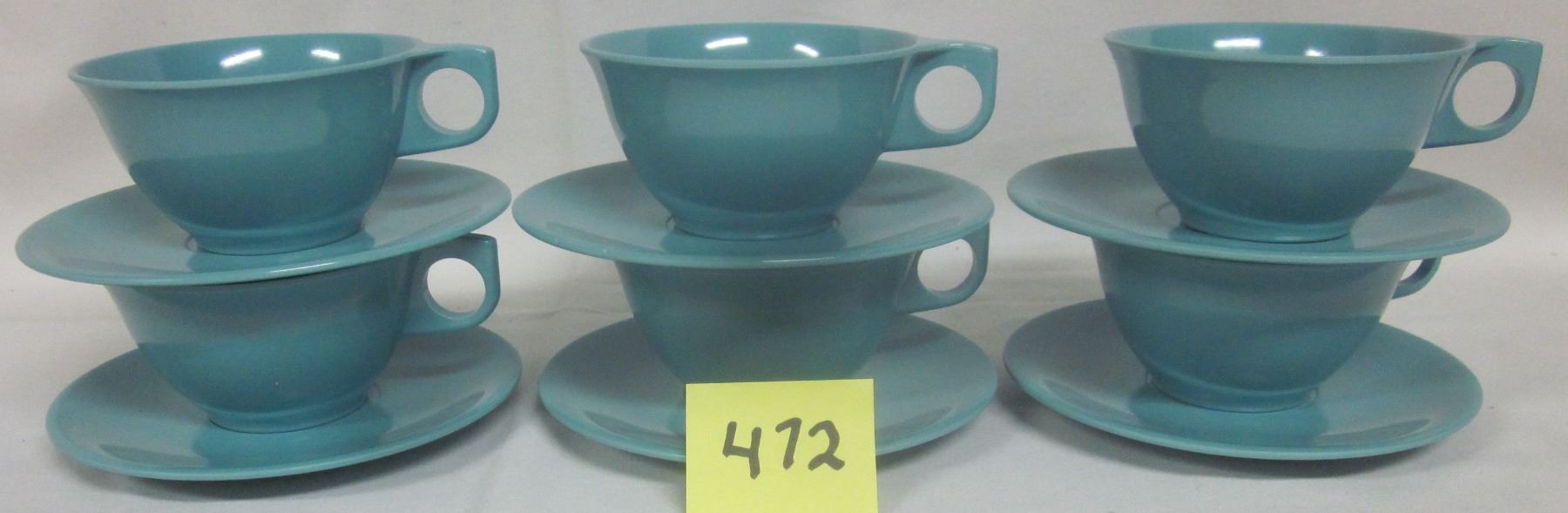 Set of 6 Blue Teal Melmac Tea Cups & Saucers