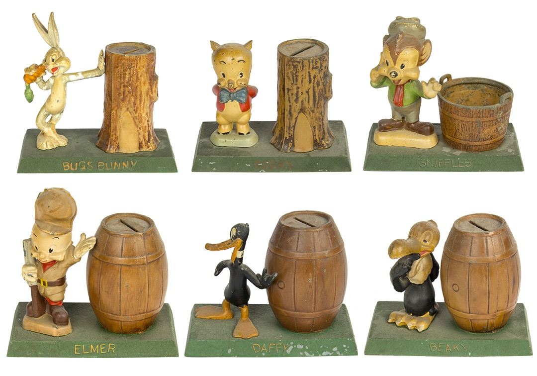 (Warner Bros, c.1940s-50s) A collection of (6) hand-painted cast metal banks manufactured by the Moss Company and featuring Bugs Bunny, Daffy Duck, Porky Pig, Beaky, Sniffles, and Elmer Fudd; some of the studio's biggest stars in the 1940s and 1950s. The figures are attached to bases that have coin receptacles that resemble logs and barrels, with the exception of the Sniffles bank which is an open bucket. The figures measure between 4.25" and 6" tall, and the condition is very good overall with some varying amounts of wear and paint loss from use and age. These banks are usually not found in such good condition. The bases of the banks do not have a latch or stopper for the coins.