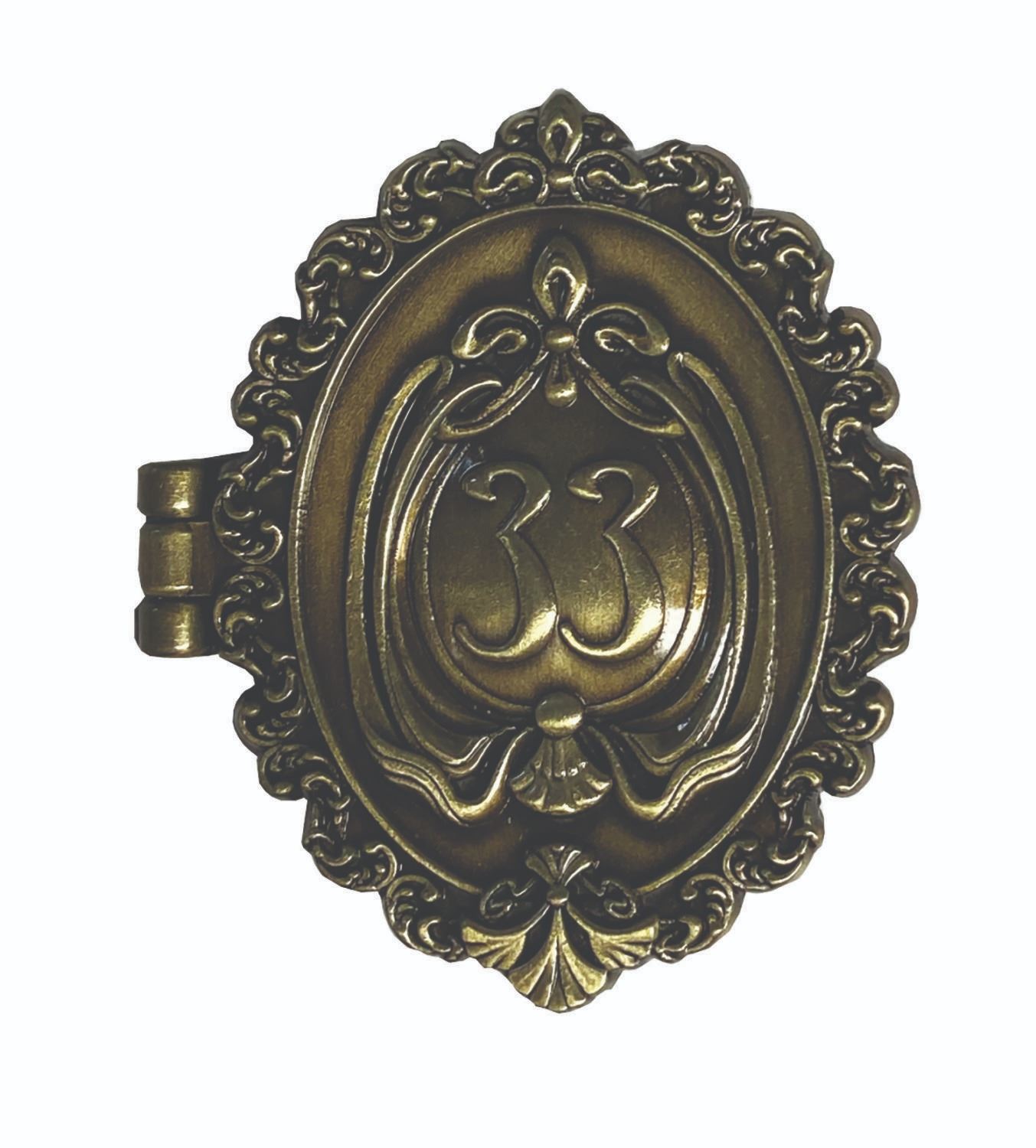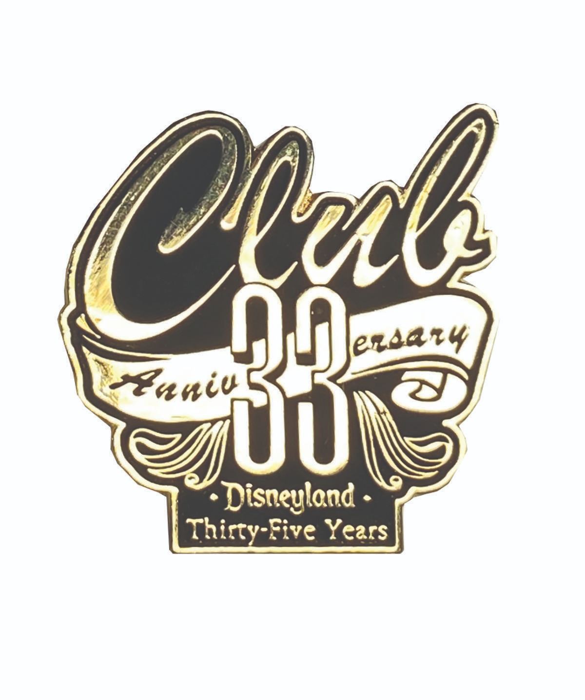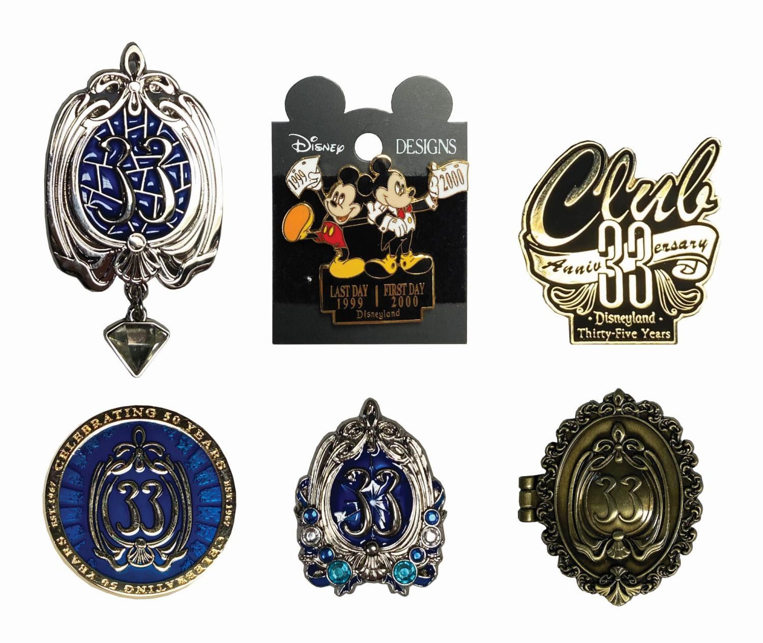 (Disneyland, c.2000s) A collection of (6) Club 33 Disneyland pins exclusively available to members of the New Orleans Square establishment. The set consists of a 35th anniversary pin, a 50th anniversary pin, a 60th anniversary pin with faux diamond charm, a 50th anniversary pin, a contemporary club logo pin with blue faux gems, a club logo hinged locket pin with interior etched portrait of Walt Disney, and a New Years Eve 1999-2000 pin. Ranging in size from 1.5"x1.5" to 2.5" x 1.5", the pins are all in very fine, as-new condition and retain their original boxes or card backs.