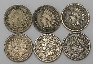 Set of 6 Copper Nickel Indian Head Cents 1859-1864