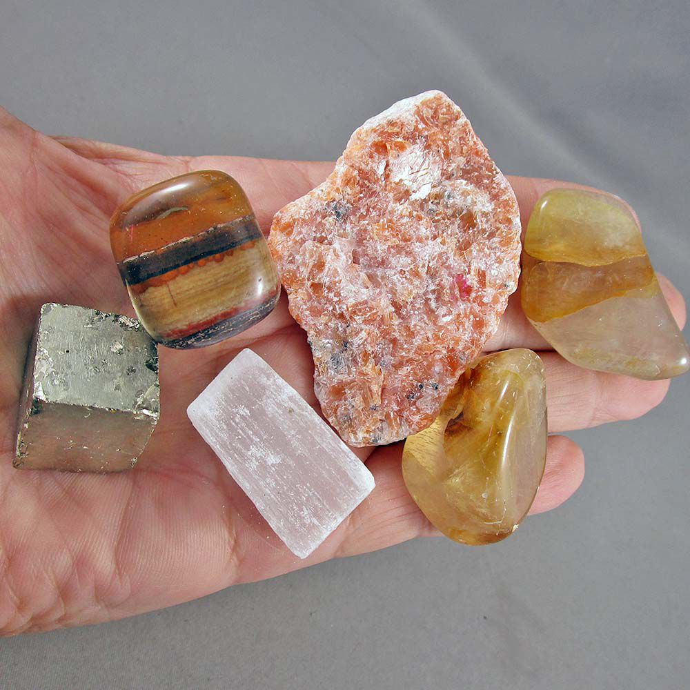 Orange Calcite, Selenite, Hematoid Quartz x2, Pyrite Cube, Tiger Eye