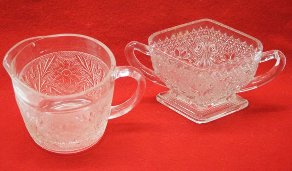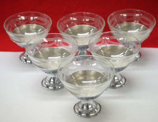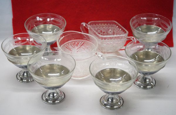 Set of 6 Two Piece Lincoln Drape Depression Glass Sherbet Glasses with Chrome Bases and glass creamer and sugar, sherbet dishes measure 3.5''H x 4''D, creamer measures 5'' x 3'' and sugar measures 6''L x 3''W x 3''H