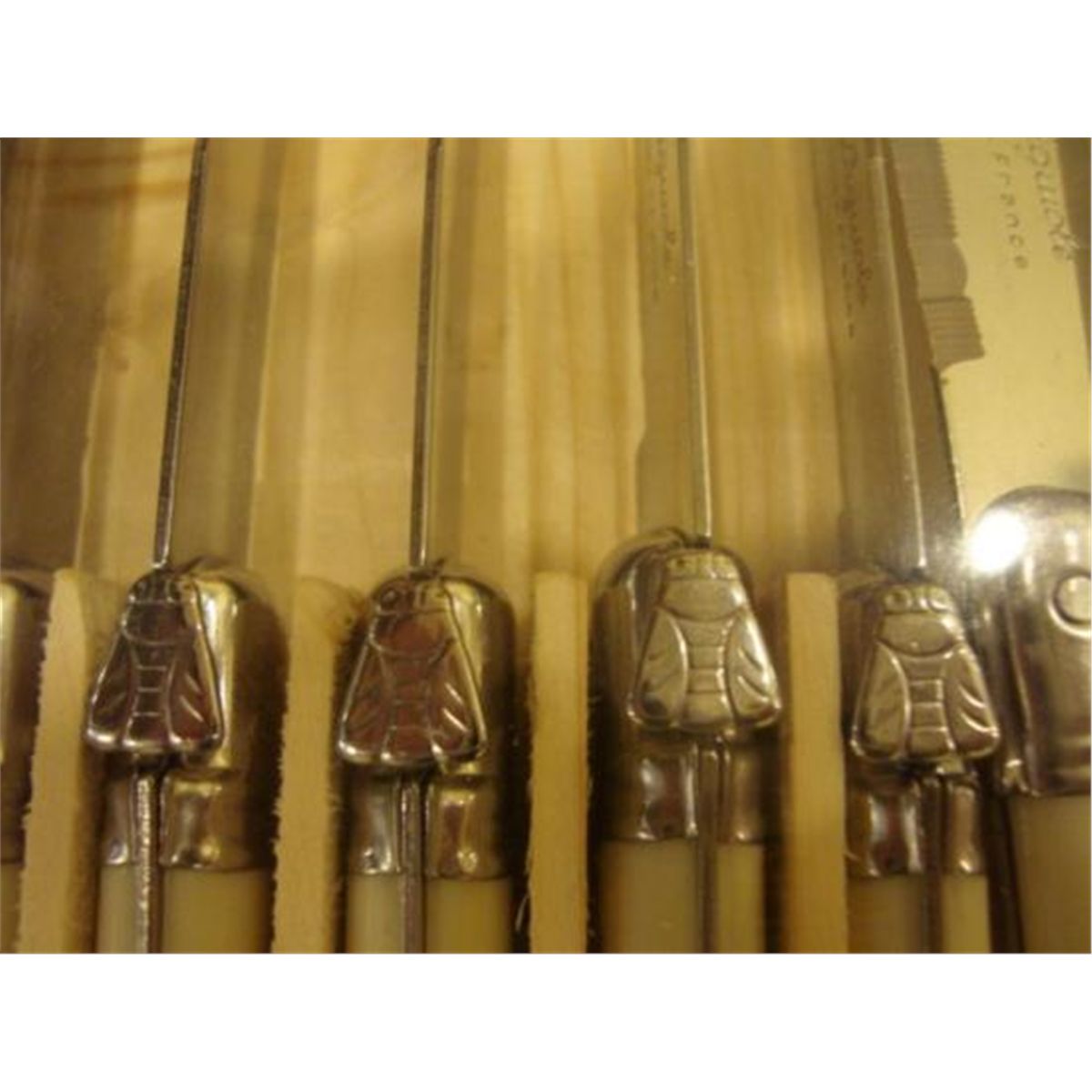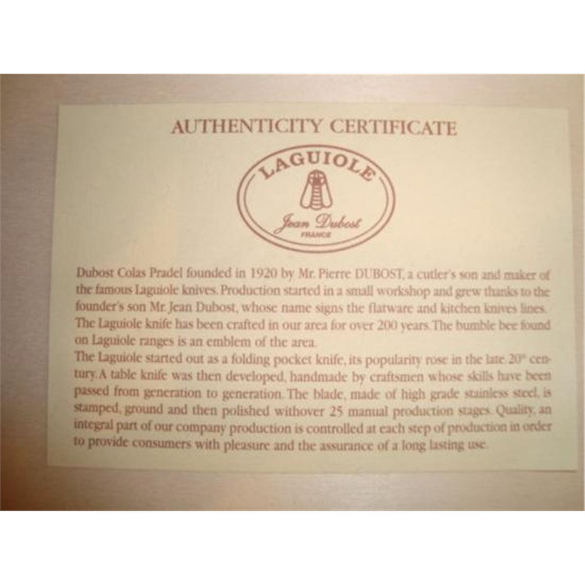 Set of 6 French Laguiole steak knives designed by Jean Dubost with its "Authenticity Certificate". These knives are dishwasher safe (acrylic handles with ivory color). DUBOST COLAS PRADEL was created in 1920, by Pierre DUBOST and his wife Marcelle COLAS PRADEL.Dubost Colas Pradel is situated in Viscomtat, a mountain village 15 km from Thiers, the capital of french cutlery.Ever since its foundation in 1920 by Pierre Dubost and his wife Marcelle Colas Pradel, the company has passed down a family tradition of fine workmanship and high quality products.It is now in the hands of the third (Philippe Dubost) and the fourth (Alexandre Dubost) generations.The company has grown in notoriety due to being attentive to the changing needs of consumers, and its faithful presence at international fairs since 1962.Since its creation Dubost Colas Pradel has been in a perpetual development.Despite having started in a small workshop, production grew rapidly under the inspiration of Jean Dubost, the founder's son, who gave his name to the famous flatware line and the world renowned kitchen knives.Quality is an integral part of the company policy.Products are quality controlled at each step of production, with care to assure good workmanship, in order to provide consumers with pleasure and the assurance of long lasting use.Ref #66130
