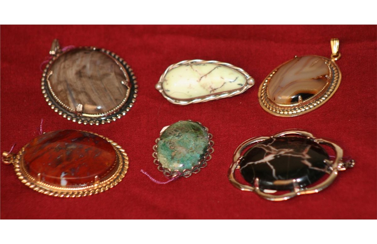 Set of 6 Items, Pendants and Pin,Citrine, Turquois Set of 6 Items, pendants and one Pin, Citrine and Silver Pin with Silver Back, 1-1/4" x 3/4",(center). Very Nice Coloring, Turquoise Pendant, 1" x 3/4", Petrified Wood Pendant, 1-1/2" Dia. Redish Brown Agate Pendant, 1-1/2" Dia., 2 Other Misc. Pendants