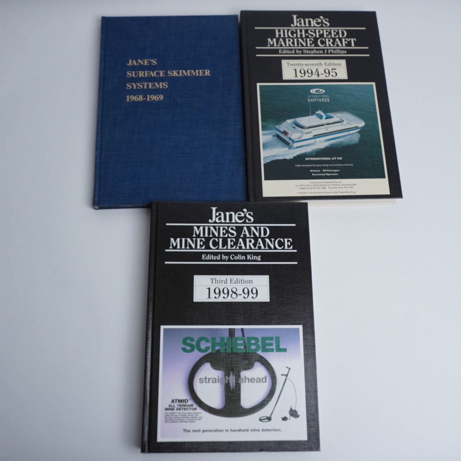 This lot features six Jane's military reference books covering a range of specialized defense topics. Included are Jane's Personal Combat Equipment 2000-2001 (First Edition), Jane's High-Speed Marine Transportation 2000-2001 and 2001-2002, Jane's Surface Skimmer Systems 1968-1969, Jane's Fighting Ships (edition year not visible), and Jane's Mines and Mine Clearance 1998-99. These authoritative publications provide in-depth analysis and technical specifications on military equipment, naval vessels, mine warfare, and transport systems, making them essential for collectors, historians, or defense analysts.