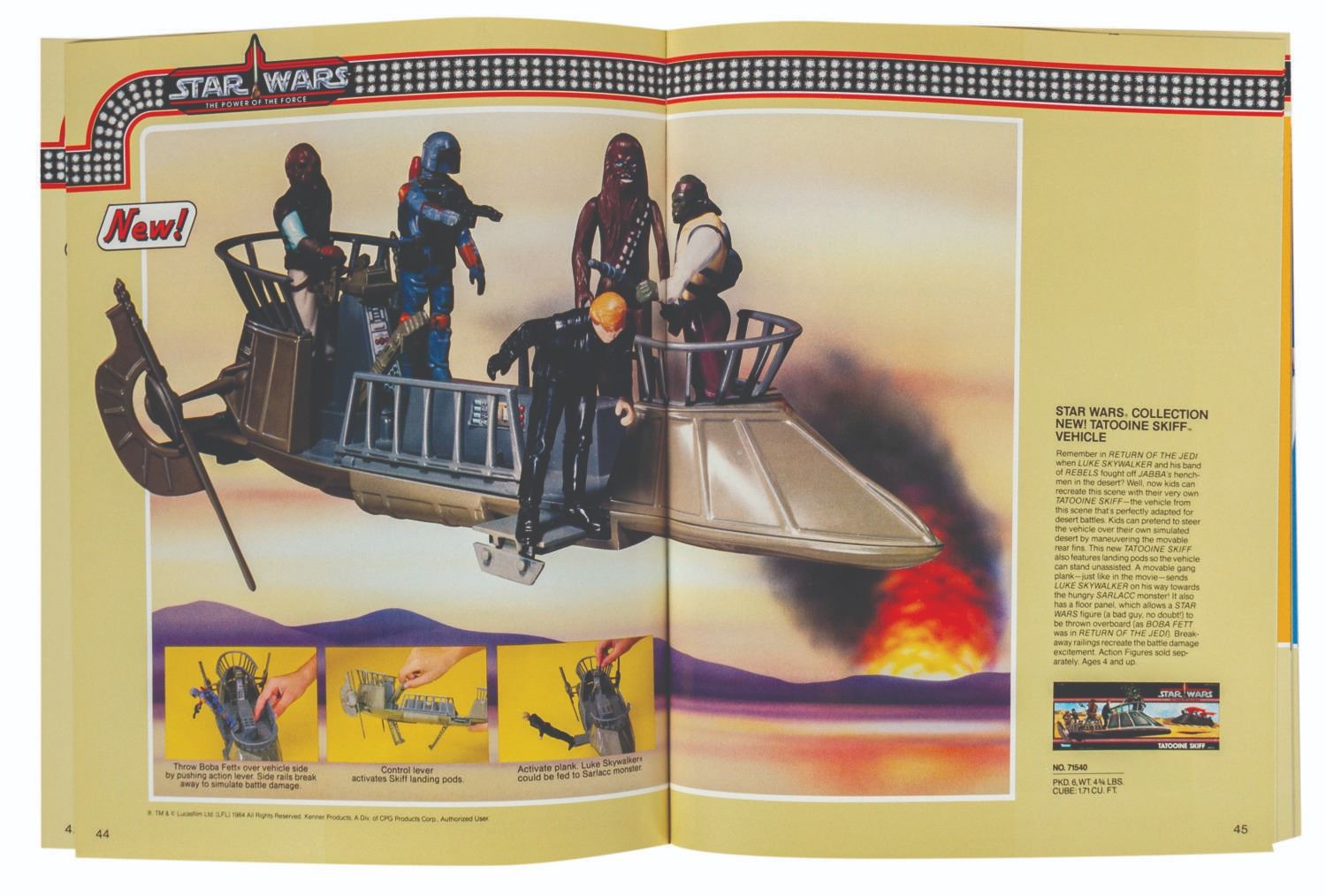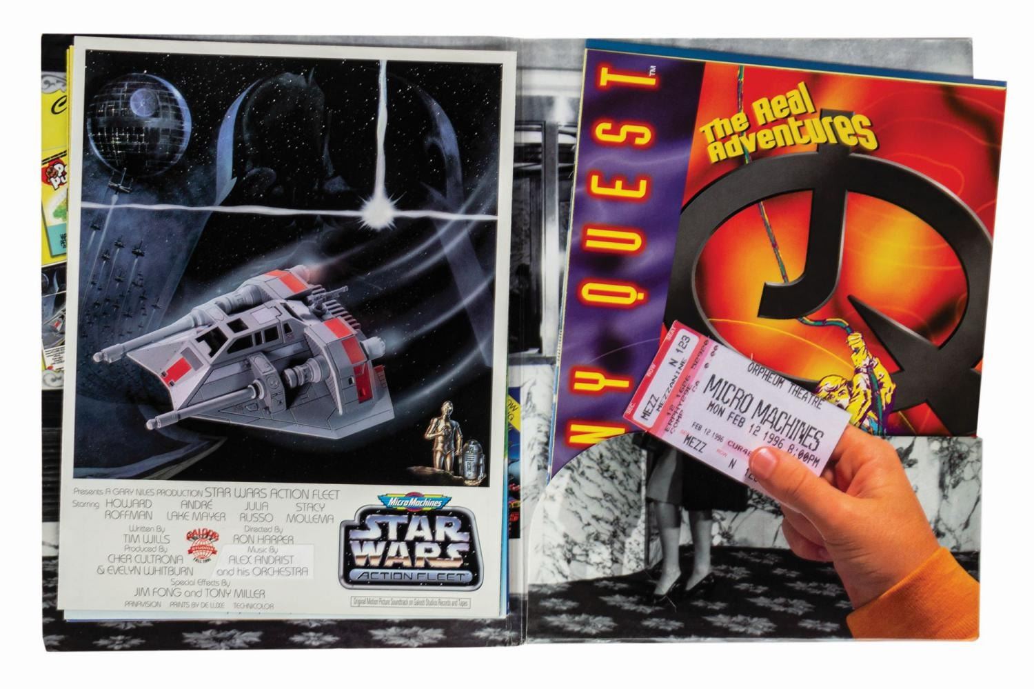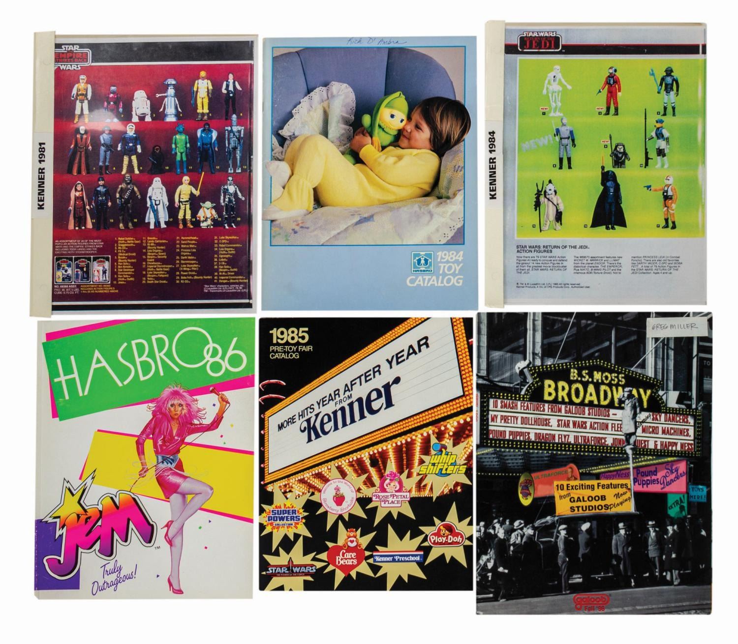 (1981-96) A collection of (6) catalogs from toy manufacturers Kenner, Hasbro, and Galoob created for in-house marketing reference or to promote upcoming lines at the Toy Fair convention. The set includes a Hasbro Research Dept. color copy of pages 98-125 from the 1981 Kenner catalog featuring the Empire Strikes Back line, a Hasbro color copy of pages 176-217 of the 1984 Kenner catalog on the Return of the Jedi line, the Hasbro 1984 catalog, the Hasbro 1986 Toy Fair catalog, the Kenner 1995 Pre-Toy Fair catalog, and the Galoob Fall '96 folder with 8 brochures. Ranging in size from 11"x8.5" to 12"x9", the catalogs are in very good condition with some wrinkling, small cover tears, and handling.