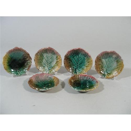 Set of 6 Majolica Begonia Leaf Butter Pats, Victorian - With original defect to the shaped edge. Nice set! Apx 3.5"x3-1/8".