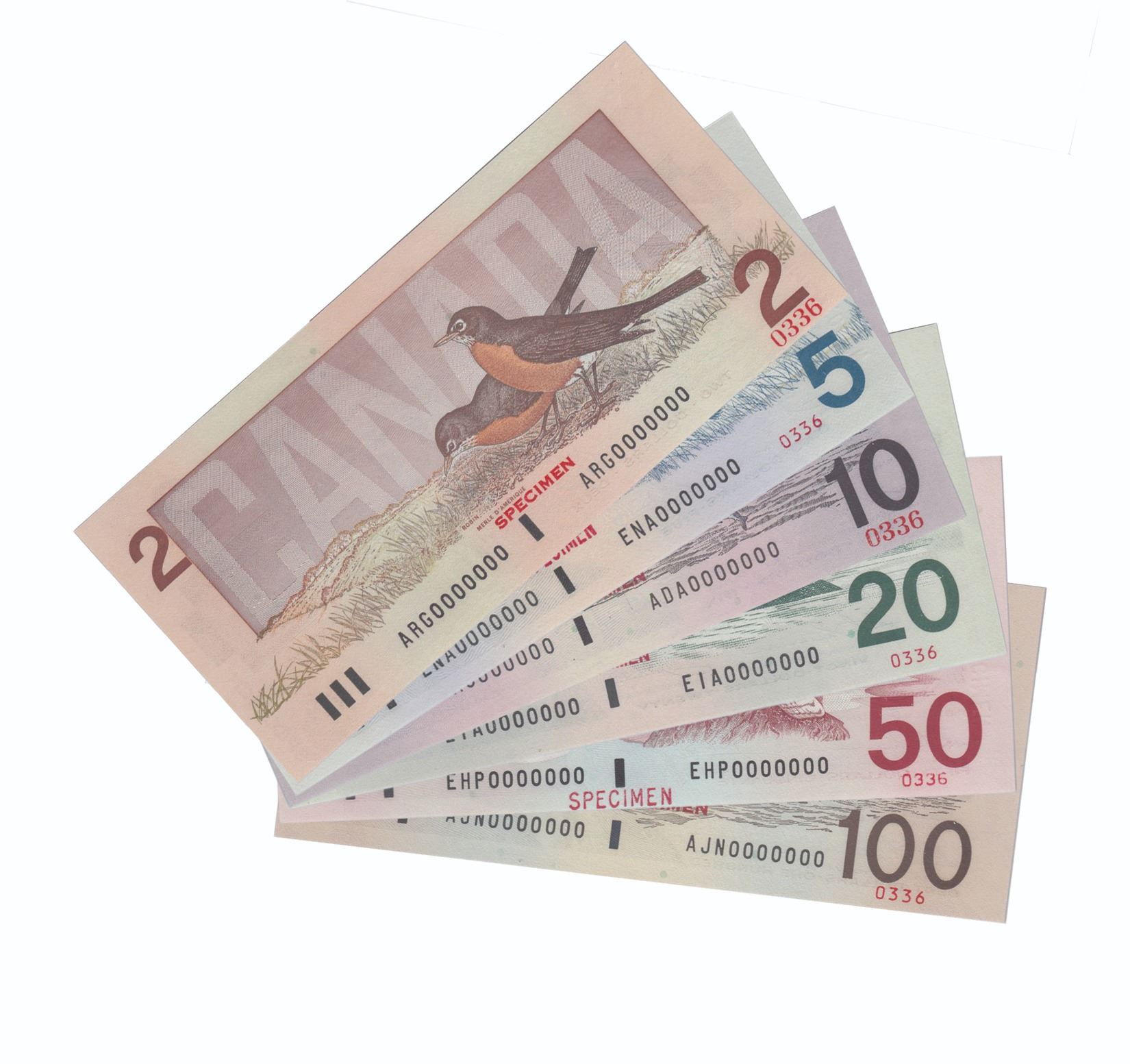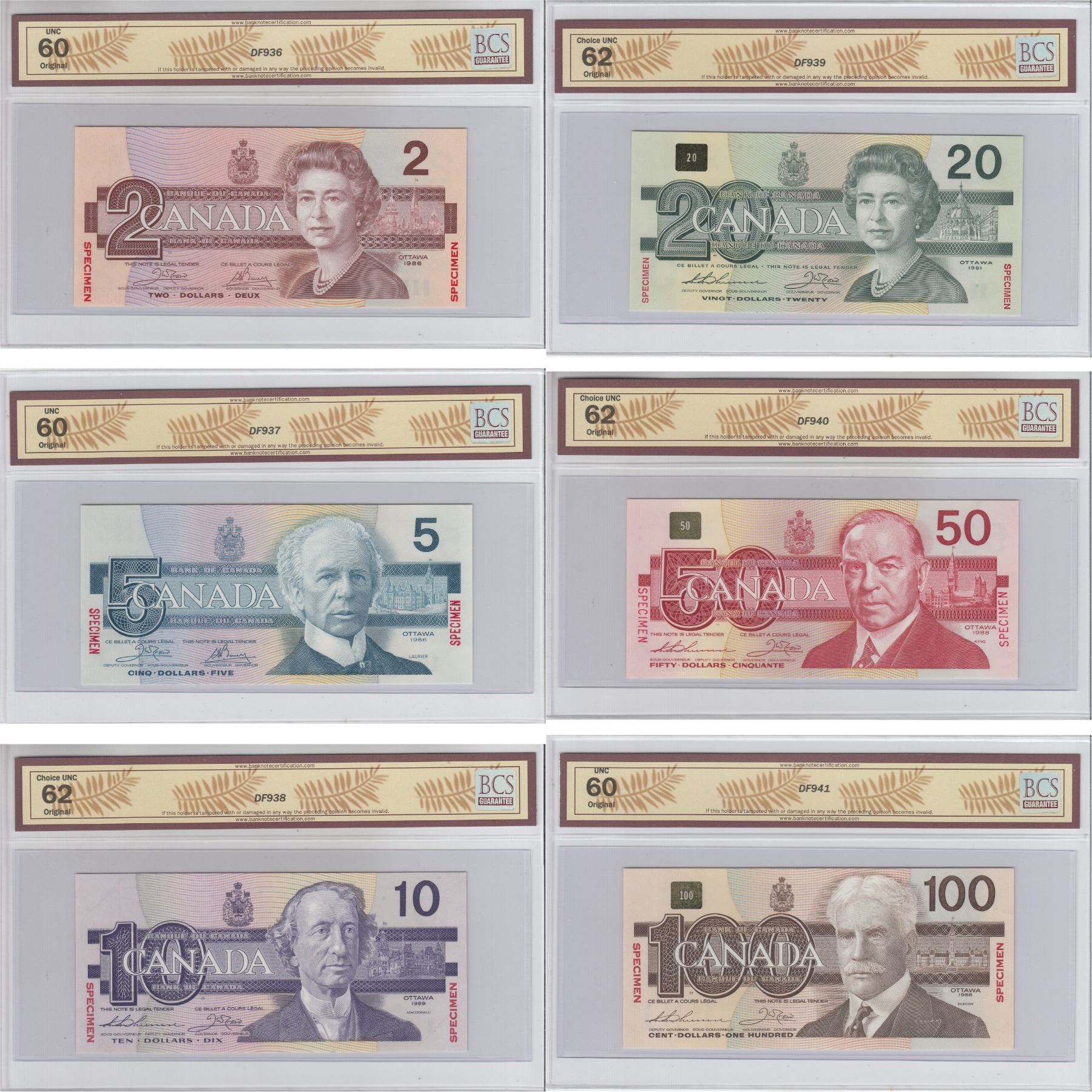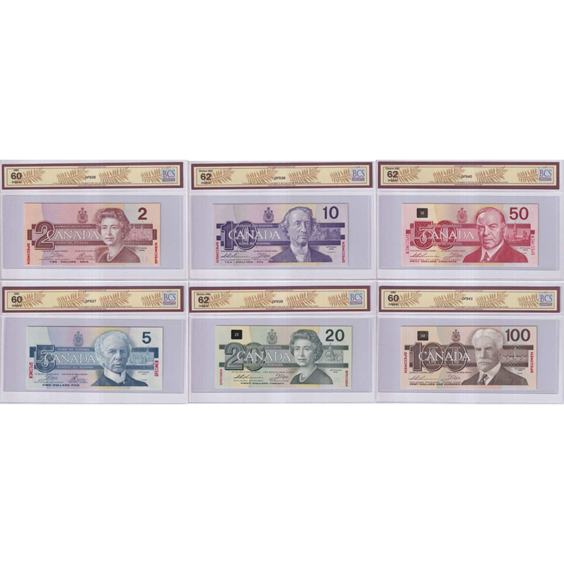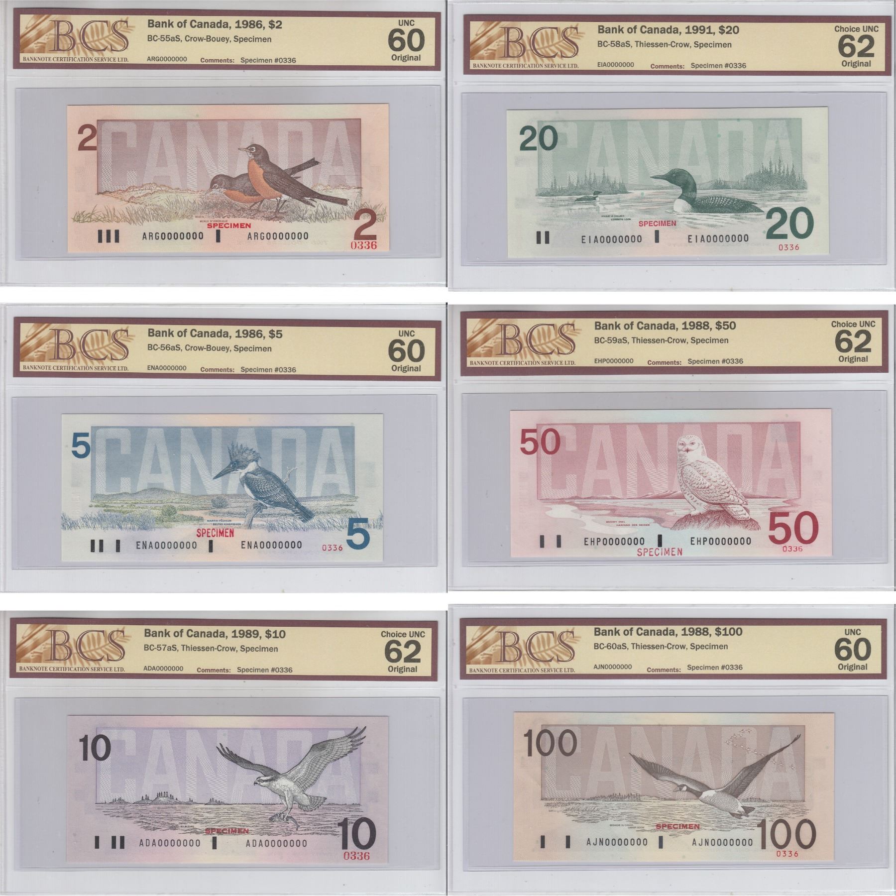 Issued in the November 2000 Bank of Canada Sale, Hosted by Moore Numismatic Auctions, Inc. The Bank of Canada sold approximately 750 matching 6 note sets ($2-$100) All BCS Certified Original!. This unique #0336 Numbered set includes: 1986 $2 BC-55aS Crow-Bouey ARG Prefix (UNC-60), 1986 $5 BC-56aS Crow-Bouey ENA (UNC-60), 1989 $10 Theissen-Crow ADA prefix (CUNC-62), 1991 $20 Theissen-Crow EIA prefix (CUNC-62), 1988 $50 Theissen-Crow EHP prefix (CUNC-62), 1988 $100 Theissen-Crow AJN prefix (UNC-60). *Note Matching "336" Multi colour 9 note set is listed in this Auction as well.