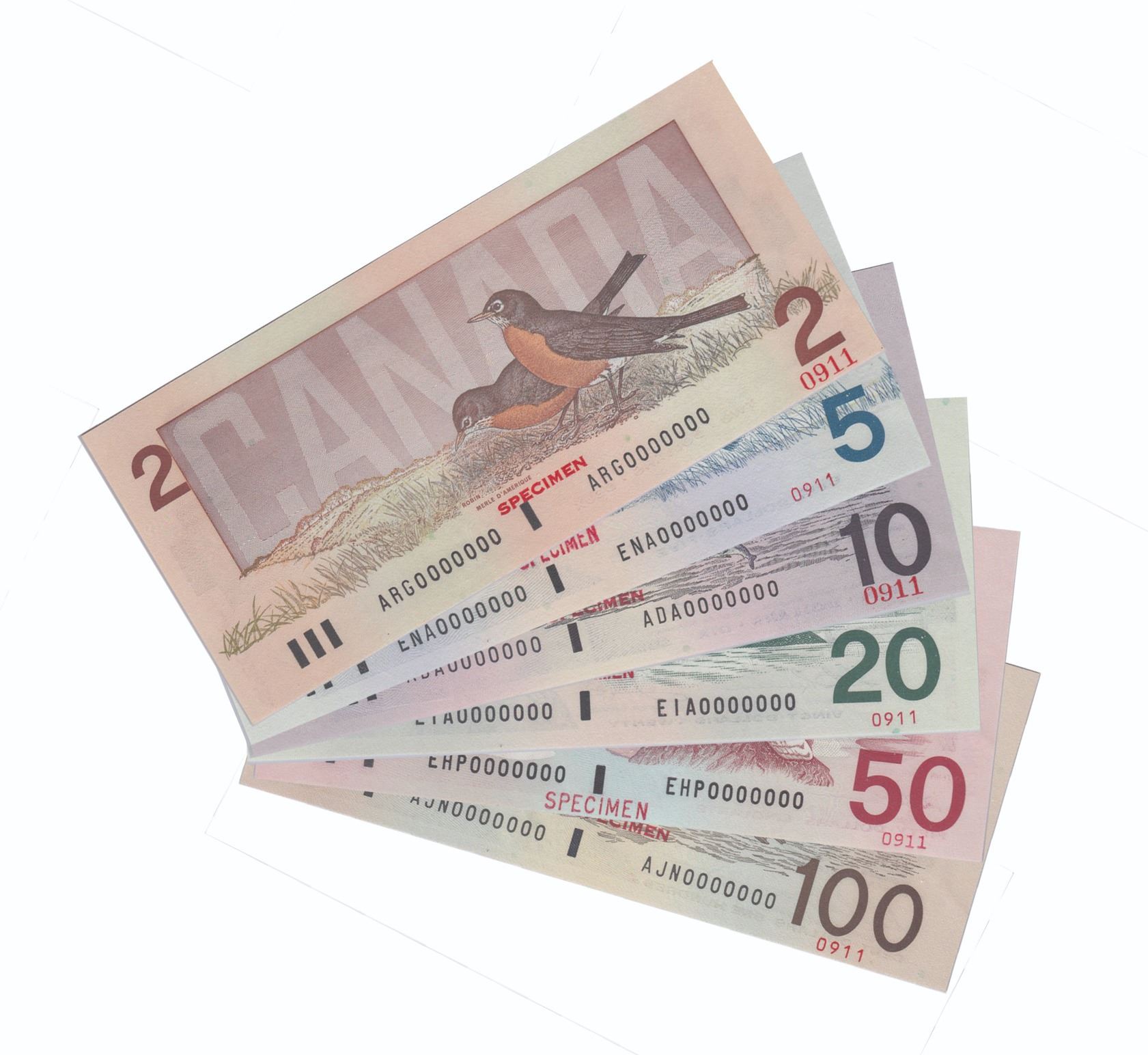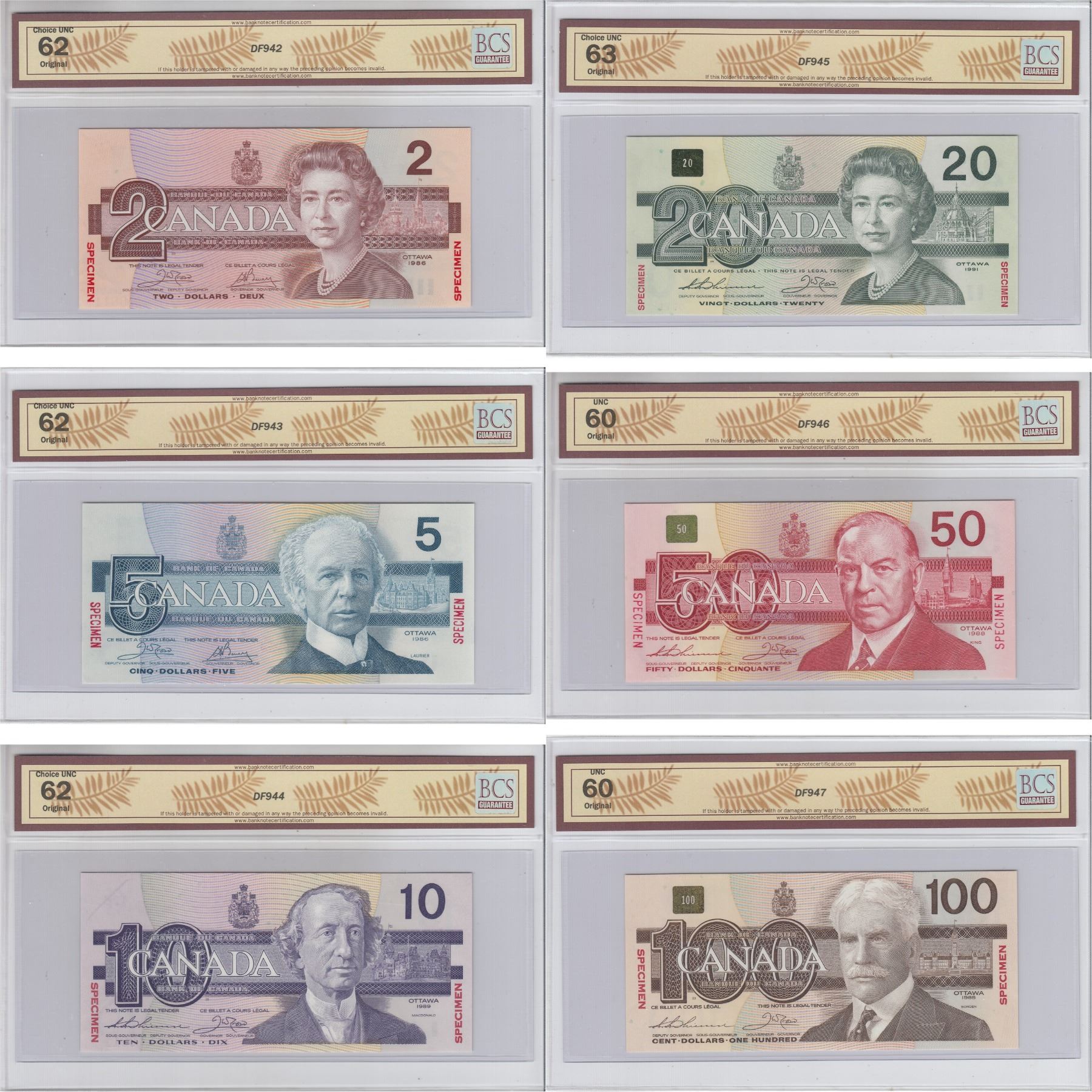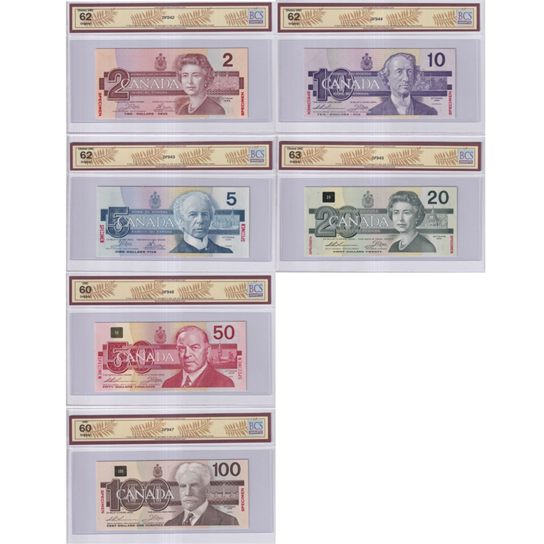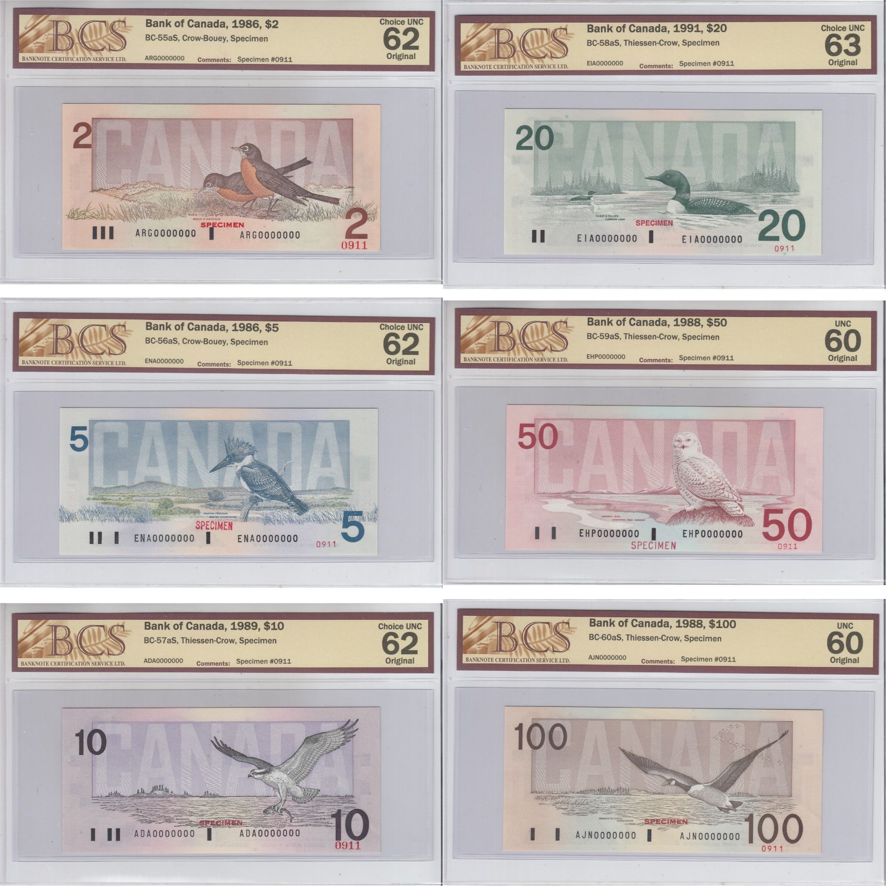 Issued in the November 2000 Bank of Canada Sale, Hosted by Moore Numismatic Auctions, Inc. The Bank of Canada sold approximately 750 matching 6 note sets ($2-$100) All BCS Certified Original!. This unique '911' Numbered set includes: 1986 $2 BC-55aS Crow-Bouey ARG Prefix (CUNC-62), 1986 $5 BC-56aS Crow-Bouey ENA (CUNC-62), 1989 $10 Theissen-Crow ADA prefix (CUNC-62), 1991 $20 Theissen-Crow EIA prefix (CUNC-63), 1988 $50 Theissen-Crow EHP prefix (UNC-60), 1988 $100 Theissen-Crow AJN prefix (UNC-60).
