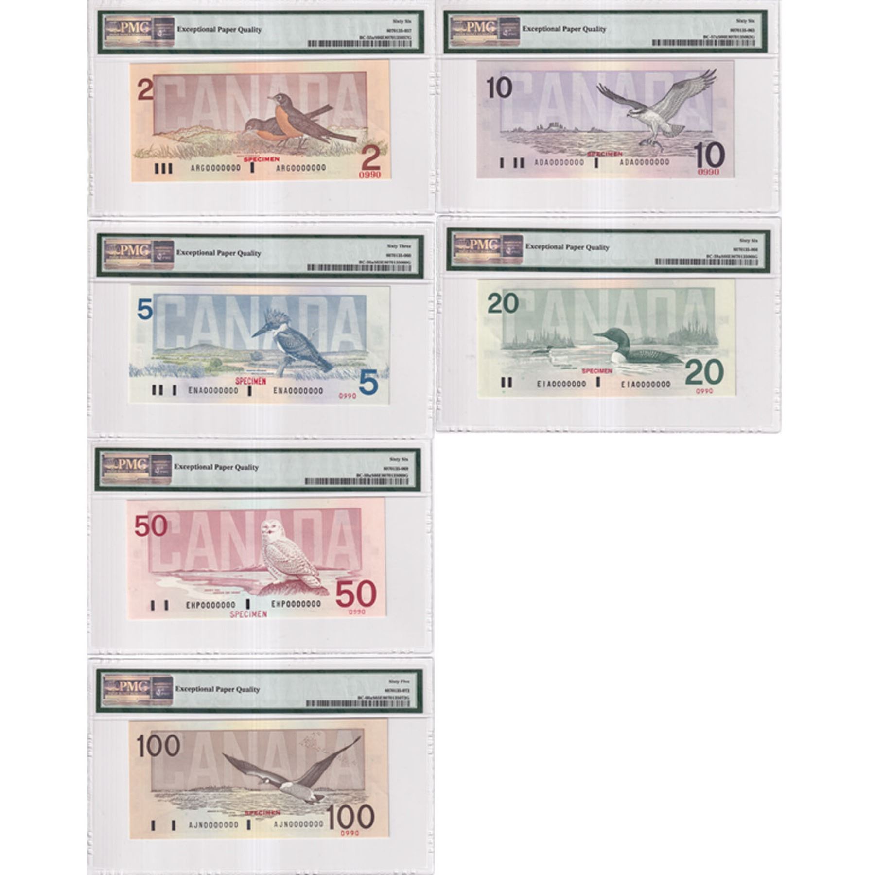 Issued in the November 2000 Bank of Canada Sale, Hosted by Moore Numismatic Auctions, Inc. The Bank of Canada sold approximately 750 matching 6 note sets ($2-$100). The set includes: 1986 $2 BC-55aS Crow-Bouey ARG Prefix (Gem UNC-66), 1986 $5 BC-56aS Crow-Bouey ENA (CUNC-63), 1989 $10 Theissen-Crow ADA prefix (Gem UNC-66), 1991 $20 Theissen-Crow EIA prefix (Gem UNC-66), 1988 $50 Theissen-Crow EHP prefix (Gem UNC-66), 1988 $100 Theissen-Crow AJN prefix (Gem UNC-65). A Great High grade set with vibrant colours and Quality!