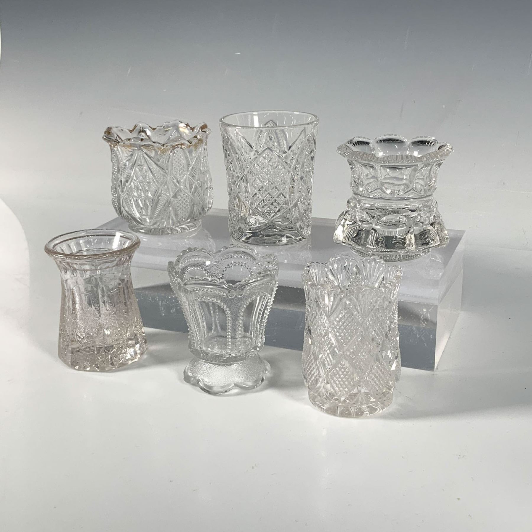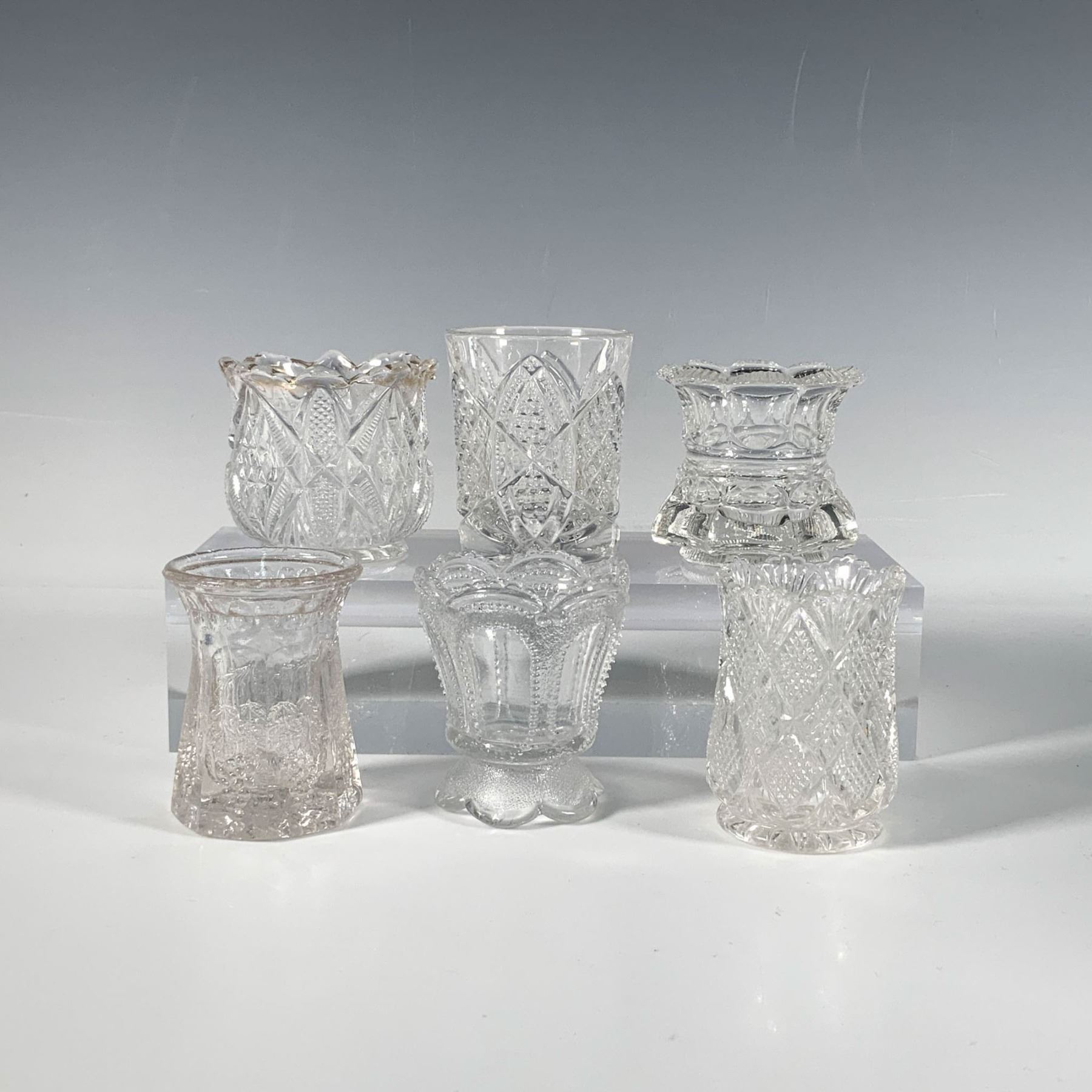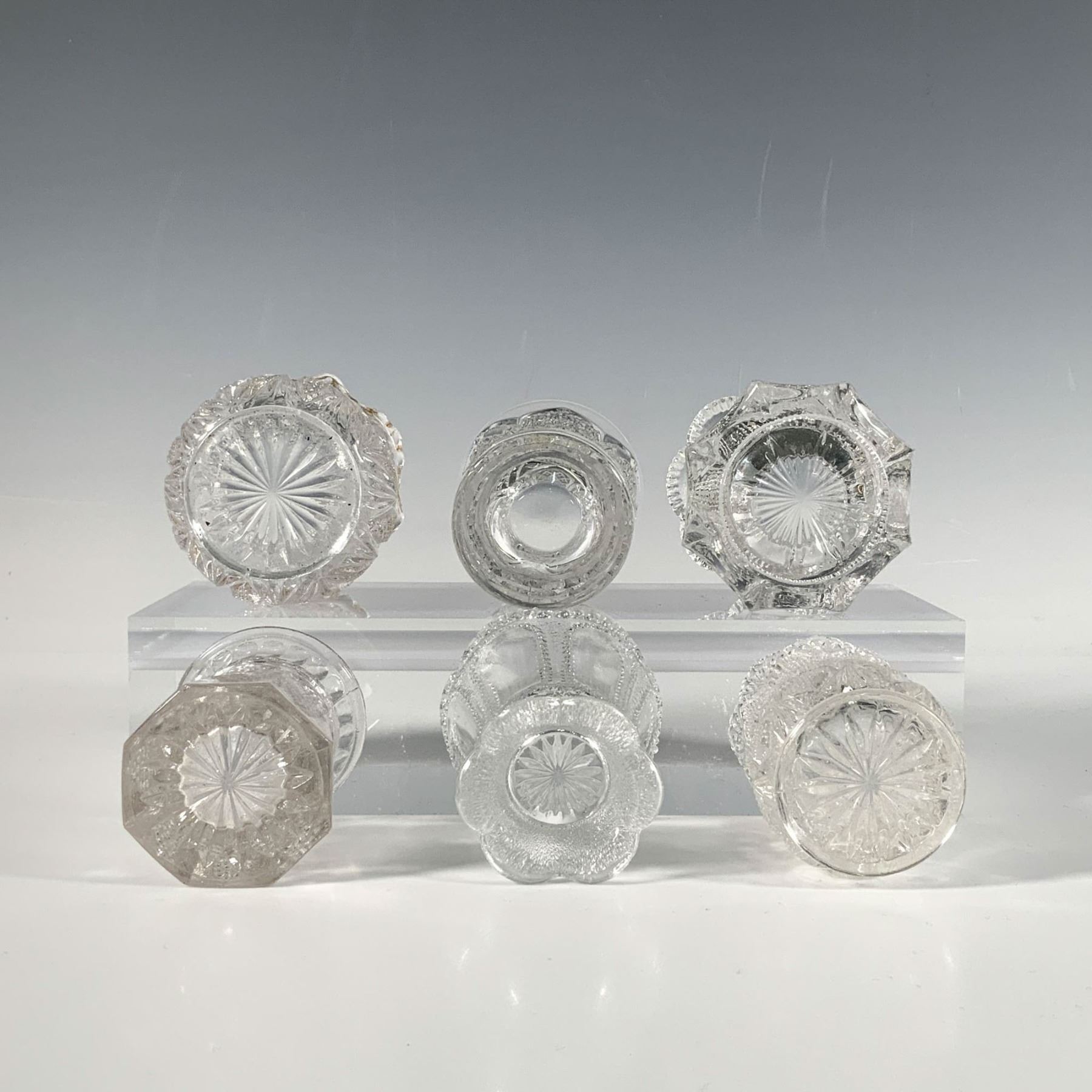 A radiant collection of small vessels featuring unique cut designs, beaded embellishments, and scalloped patterns. Largest item: 2.5"W x 2.25"H.