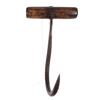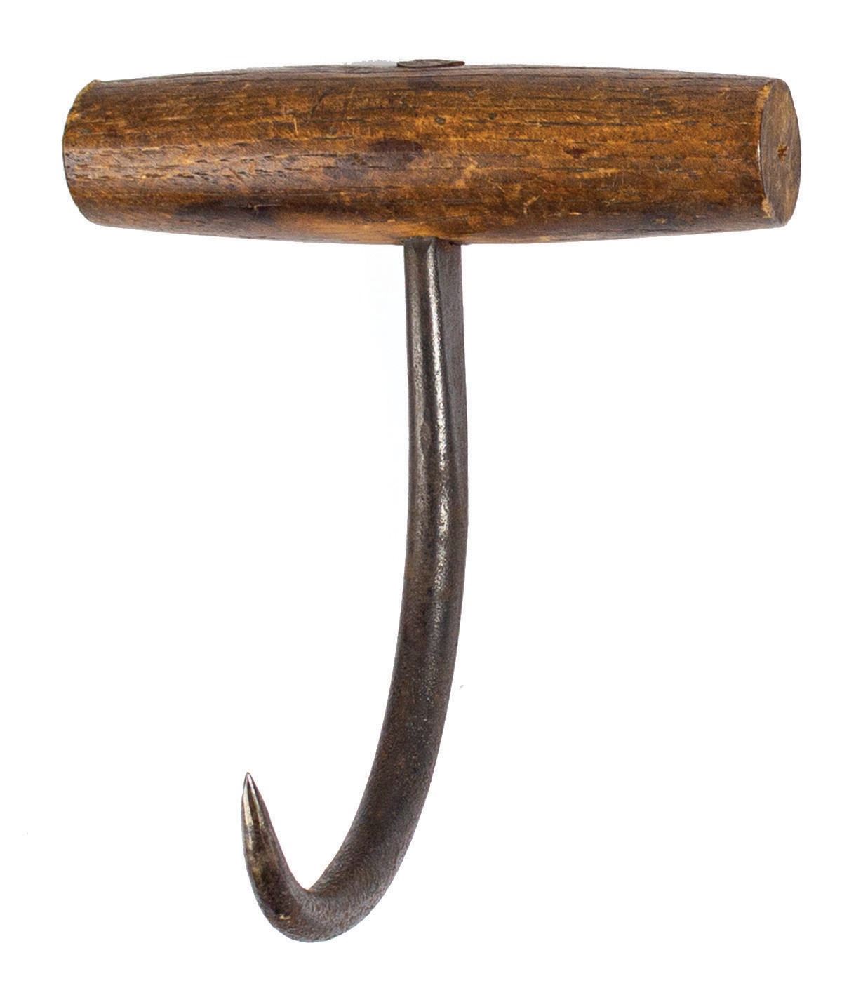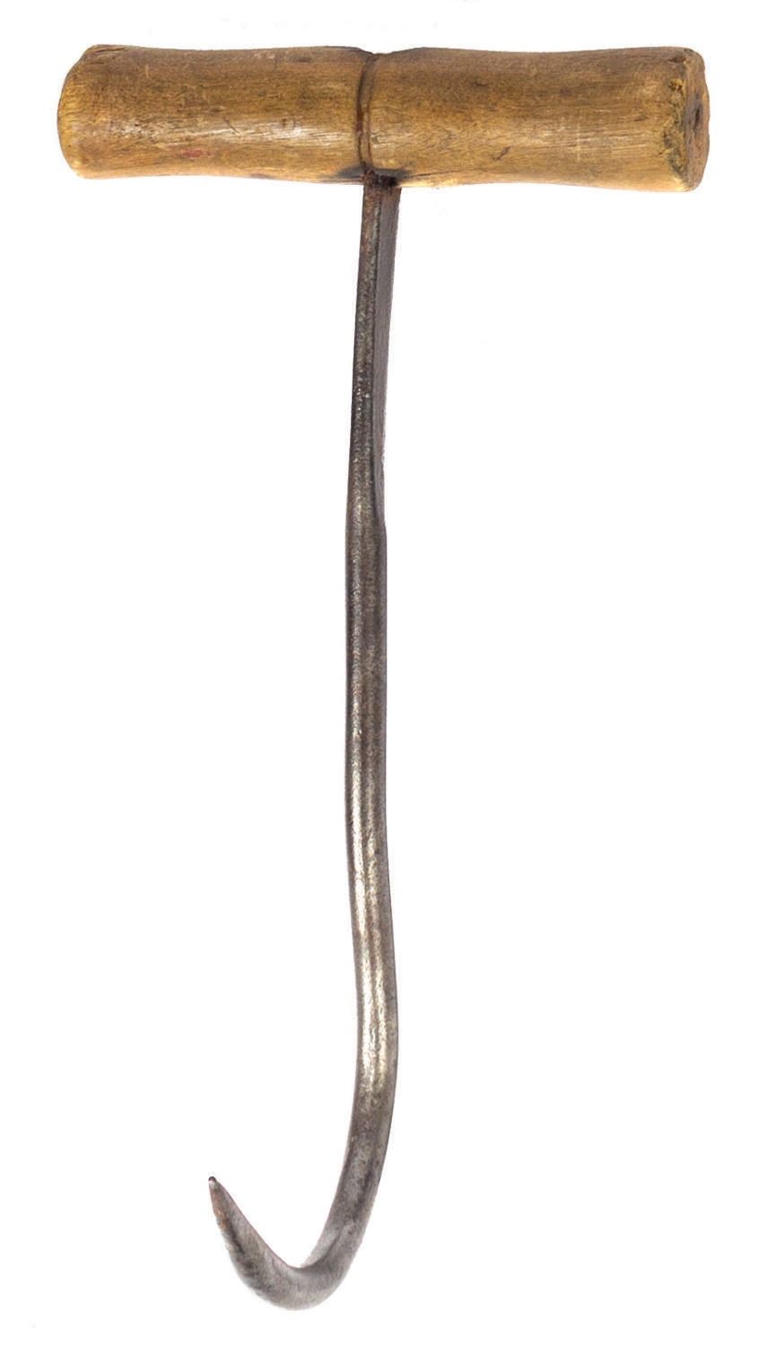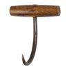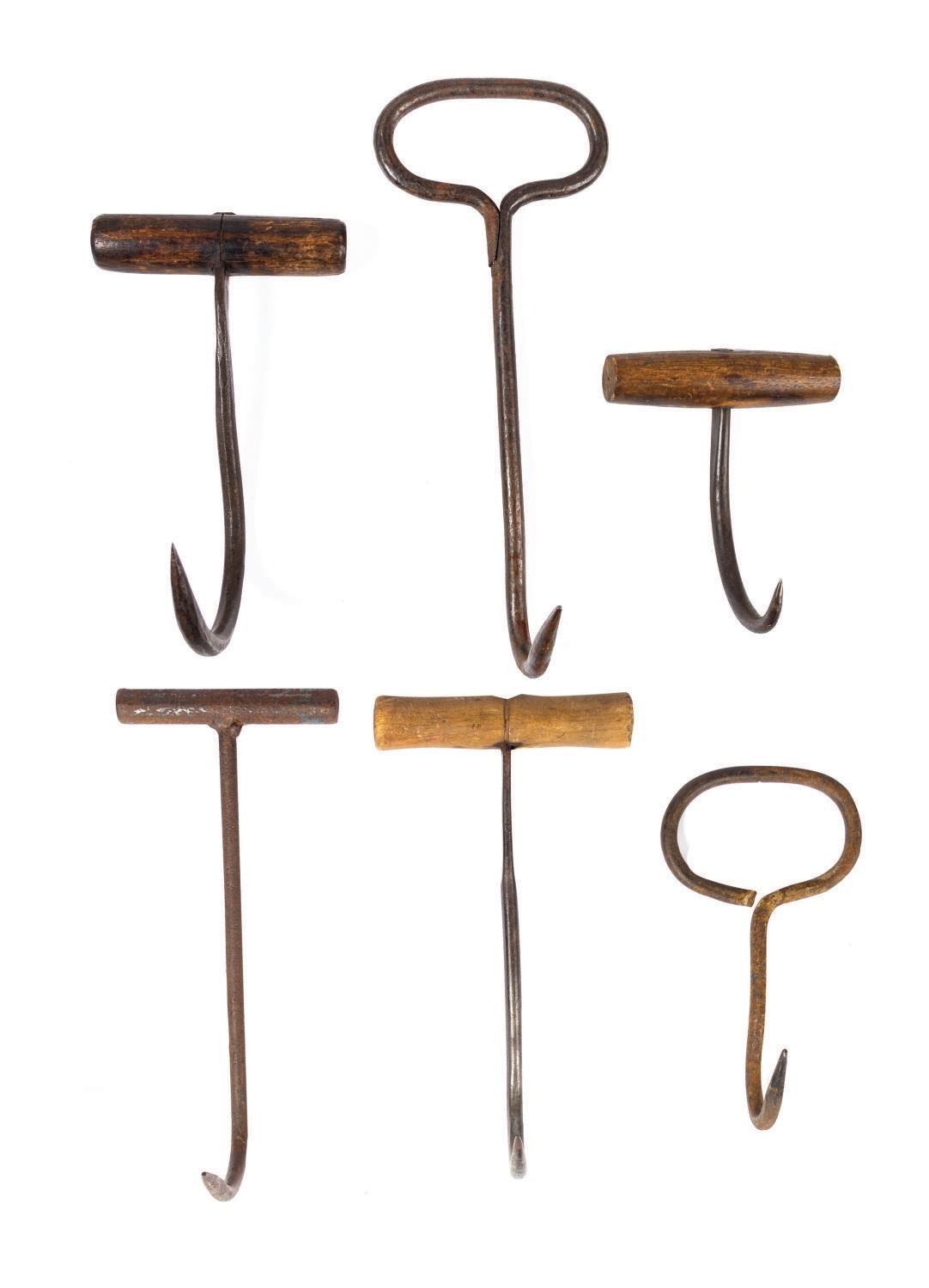(Continental, 1968) A collection of (6) meat hooks used in the horror film Night of the Living Dead. Known for redefining the use of the word "zombie" into the reanimated corpse we know today, Romero's first film of six in The Dead series is a cult classic. These meat hooks are used by the zombie-hunting posse to aid in their disposal of corpses. Composed of wood and metal, the hooks range in size from 5" to 10.5". They are in very good condition with expected wear from use.