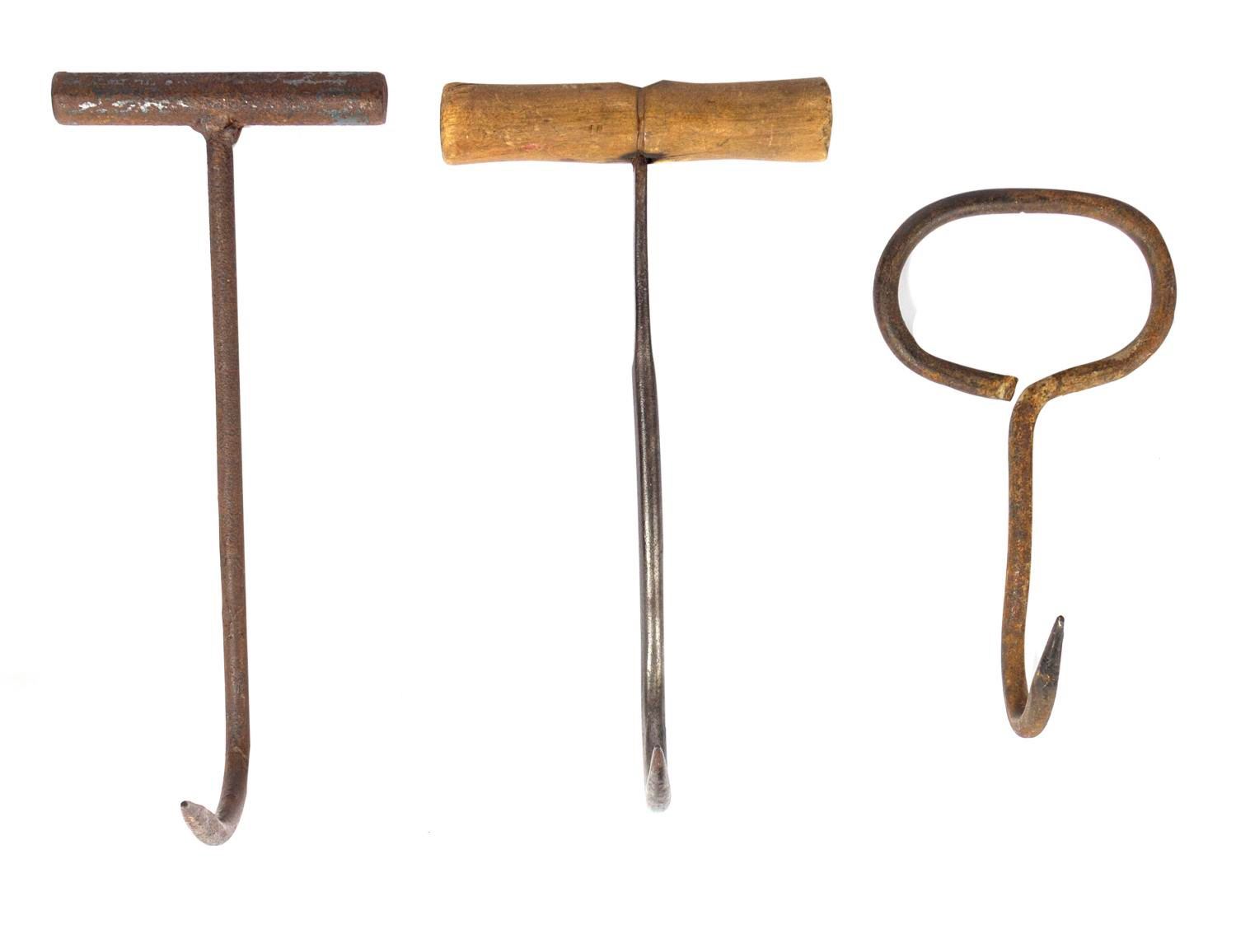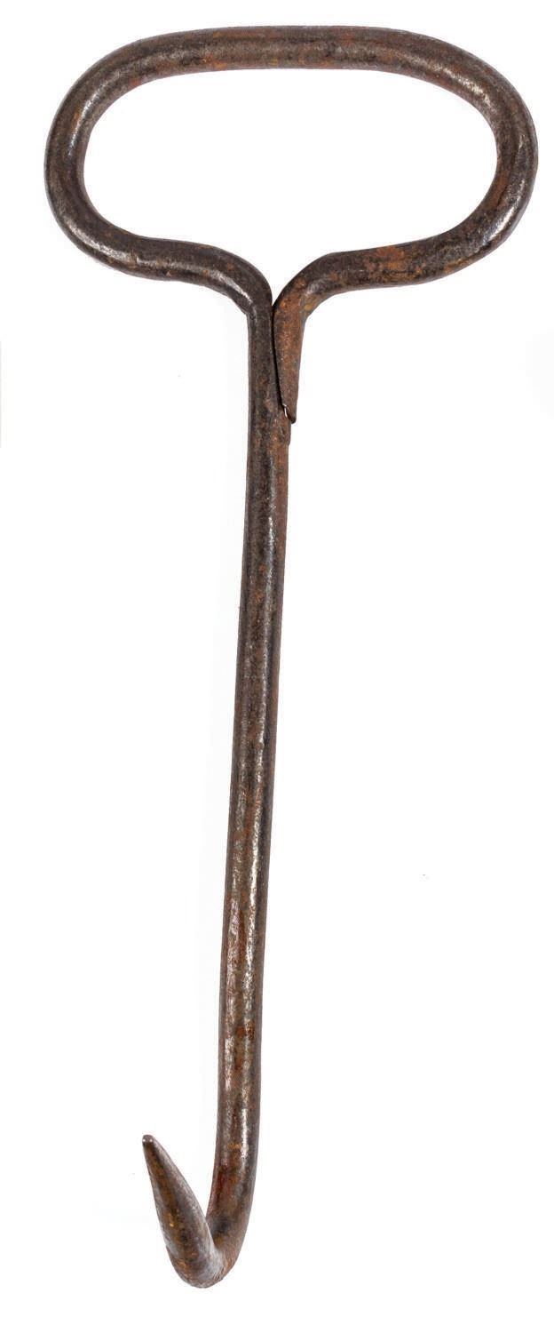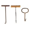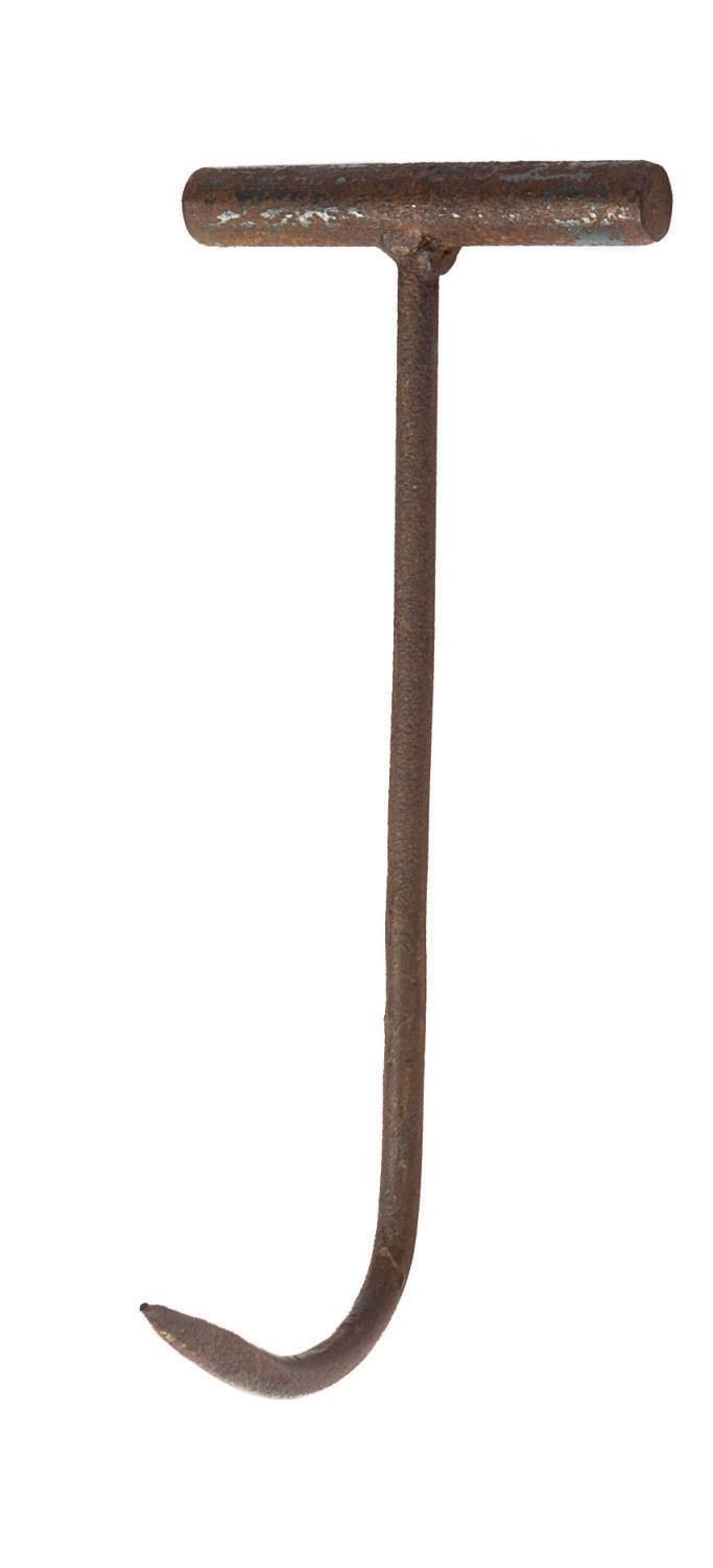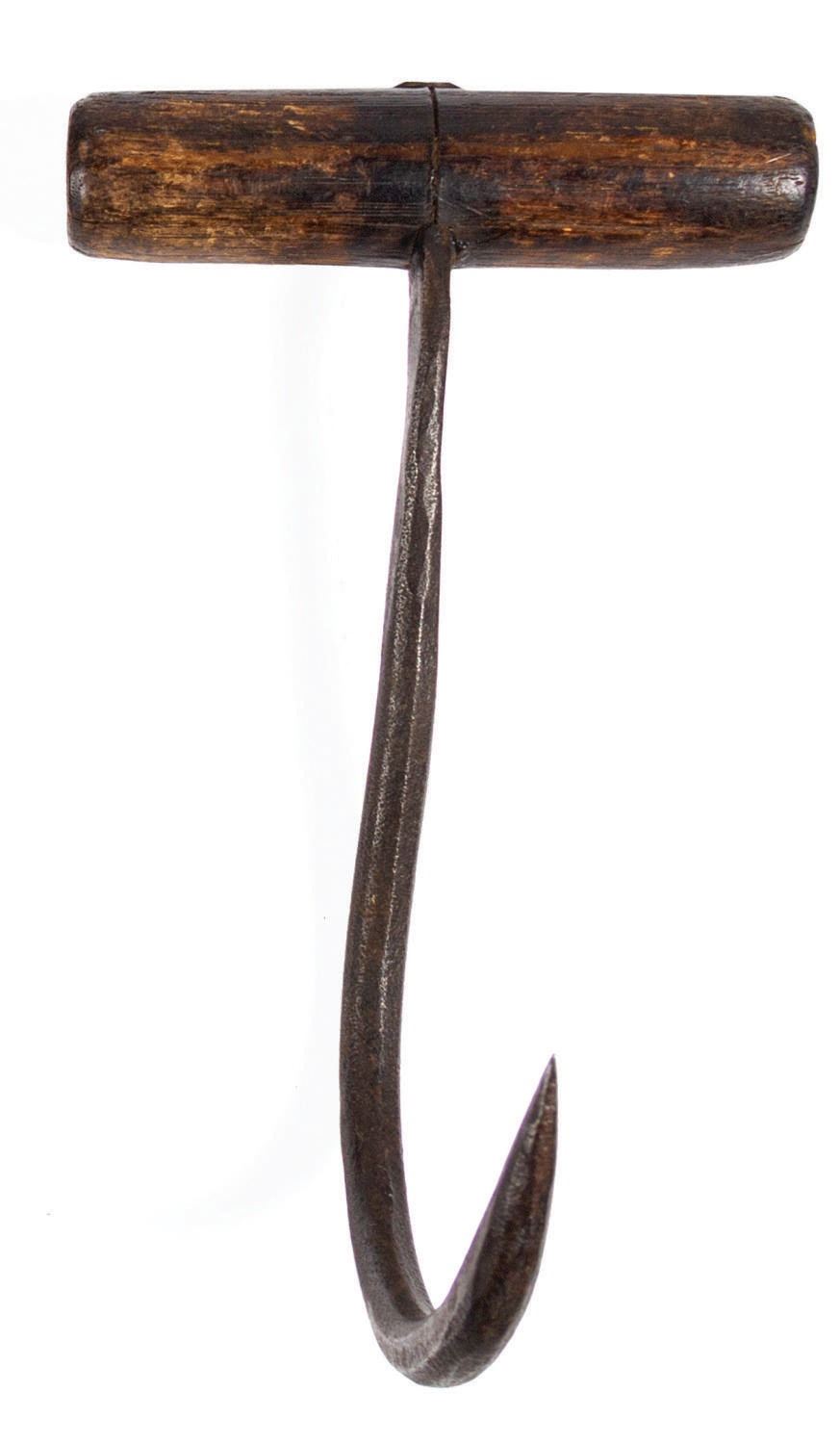 (Continental, 1968) A collection of (6) meat hooks used in the horror film Night of the Living Dead. Known for redefining the use of the word "zombie" into the reanimated corpse we know today, Romero's first film of six in The Dead series is a cult classic. These meat hooks are used by the zombie-hunting posse to aid in their disposal of corpses. Composed of wood and metal, the hooks range in size from 5" to 10.5". They are in very good condition with expected wear from use.