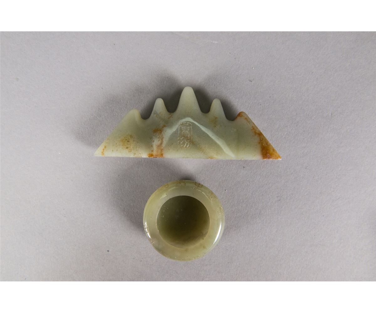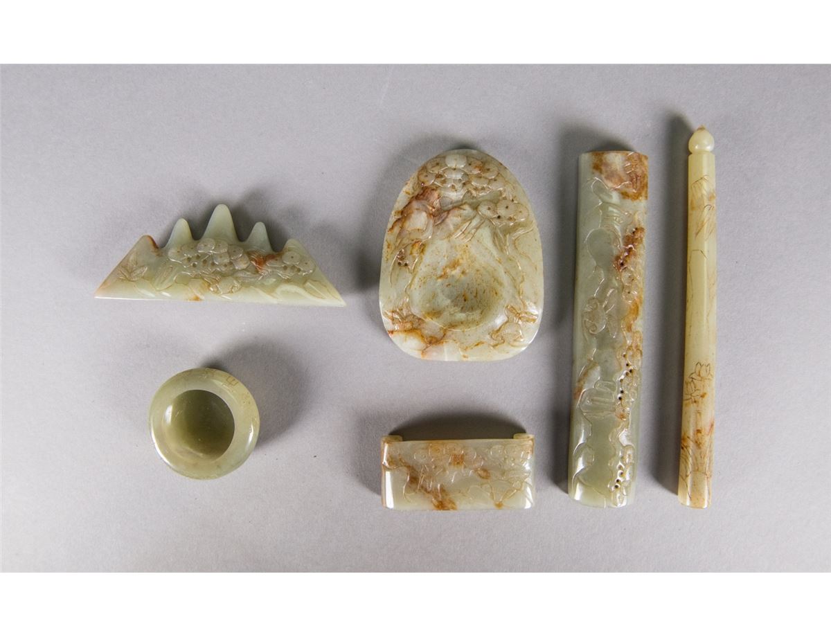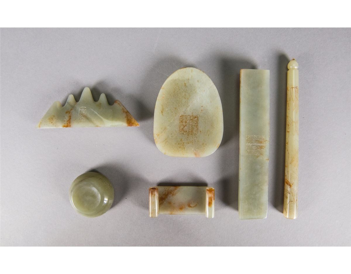 Set of six pieces Chinese white jade carved scholar tools; comprised of two brush nests, three paper weights and a ring; of celadon green tone; H: 9.5cm, W: 7.5 cm, 196 grams