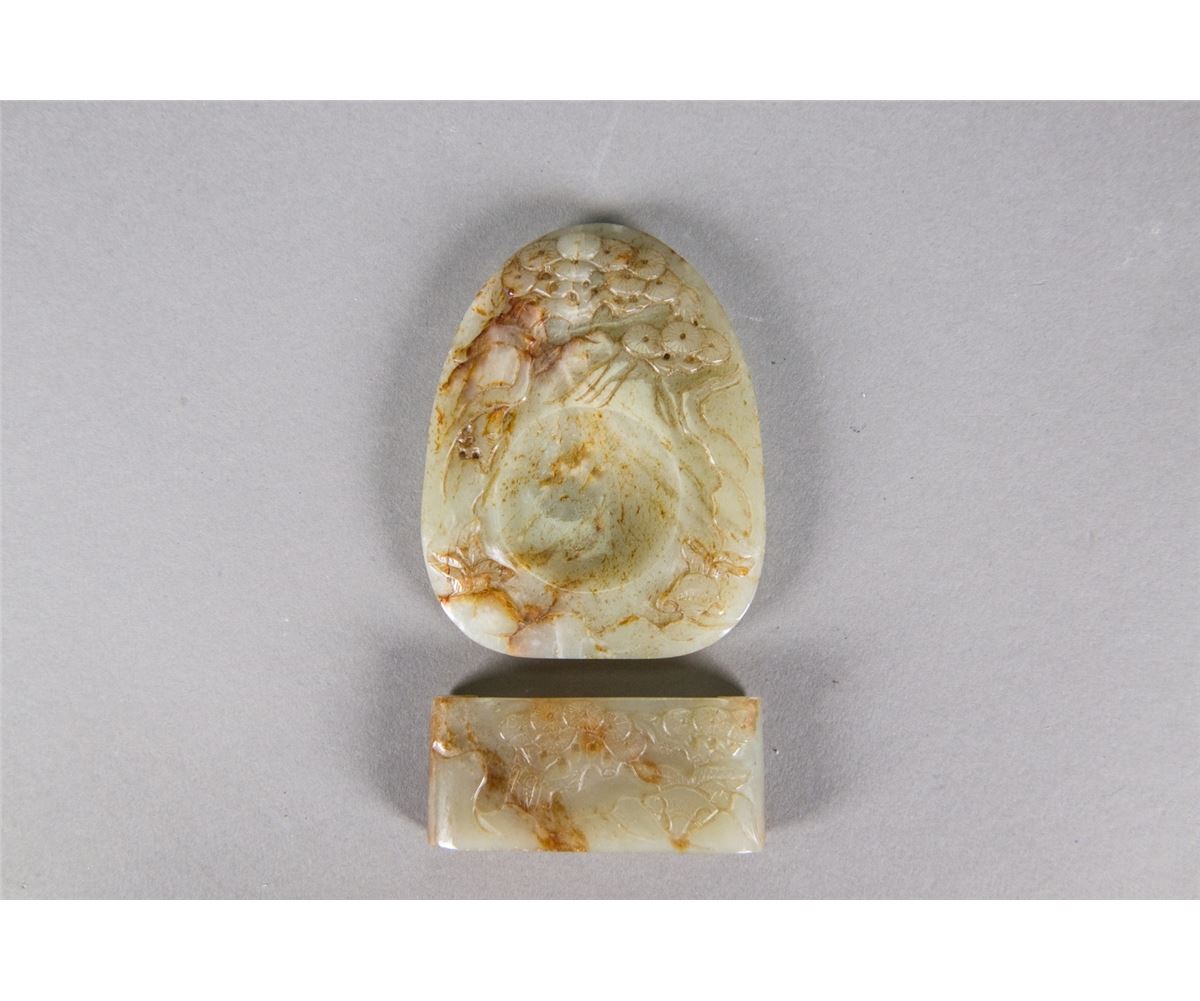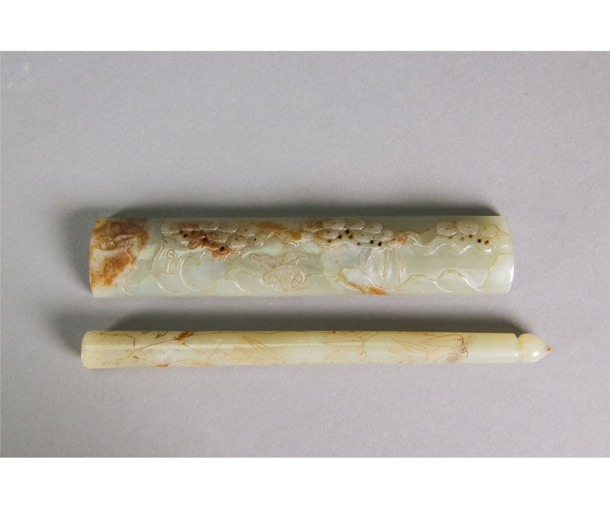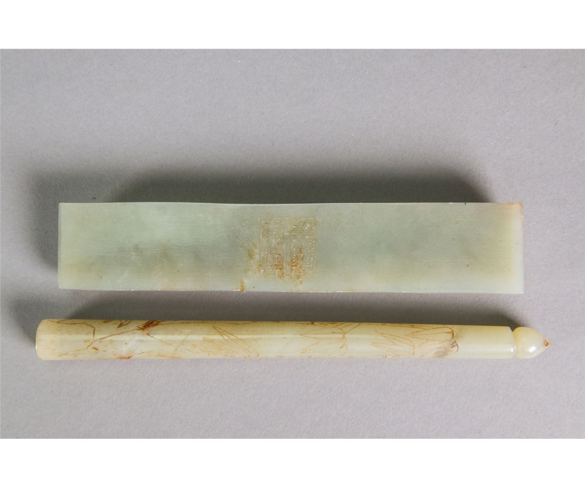 Set of six pieces Chinese white jade carved scholar tools; comprised of two brush nests, three paper weights and a ring; of celadon green tone; H: 9.5cm, W: 7.5 cm, 196 grams