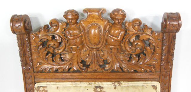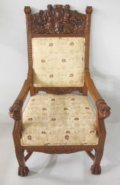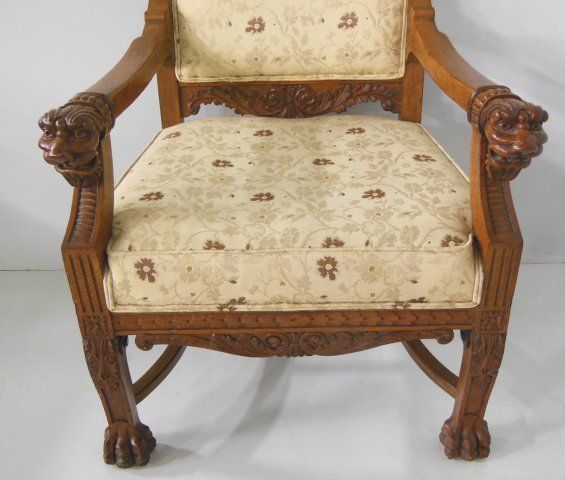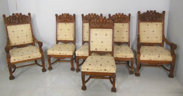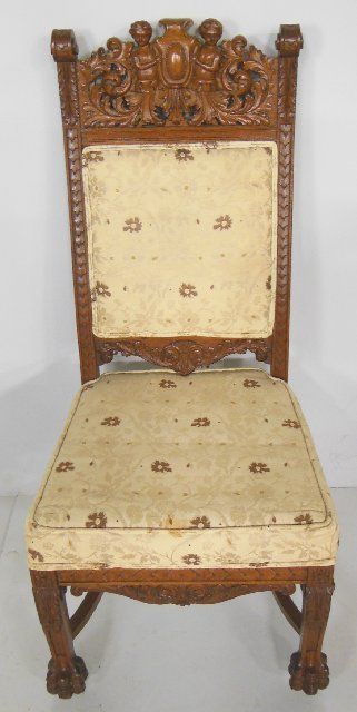 Stretcher back, 4 side, 2 arm, each chairs has detailed scroll work & crests, with 2 "Cherubs", claw legs, arm chairs have "Lion Heads" on the arms, original finish, stretcher on one partially missing. Side chairs approx. 46" H, arm chairs 47.5" H.