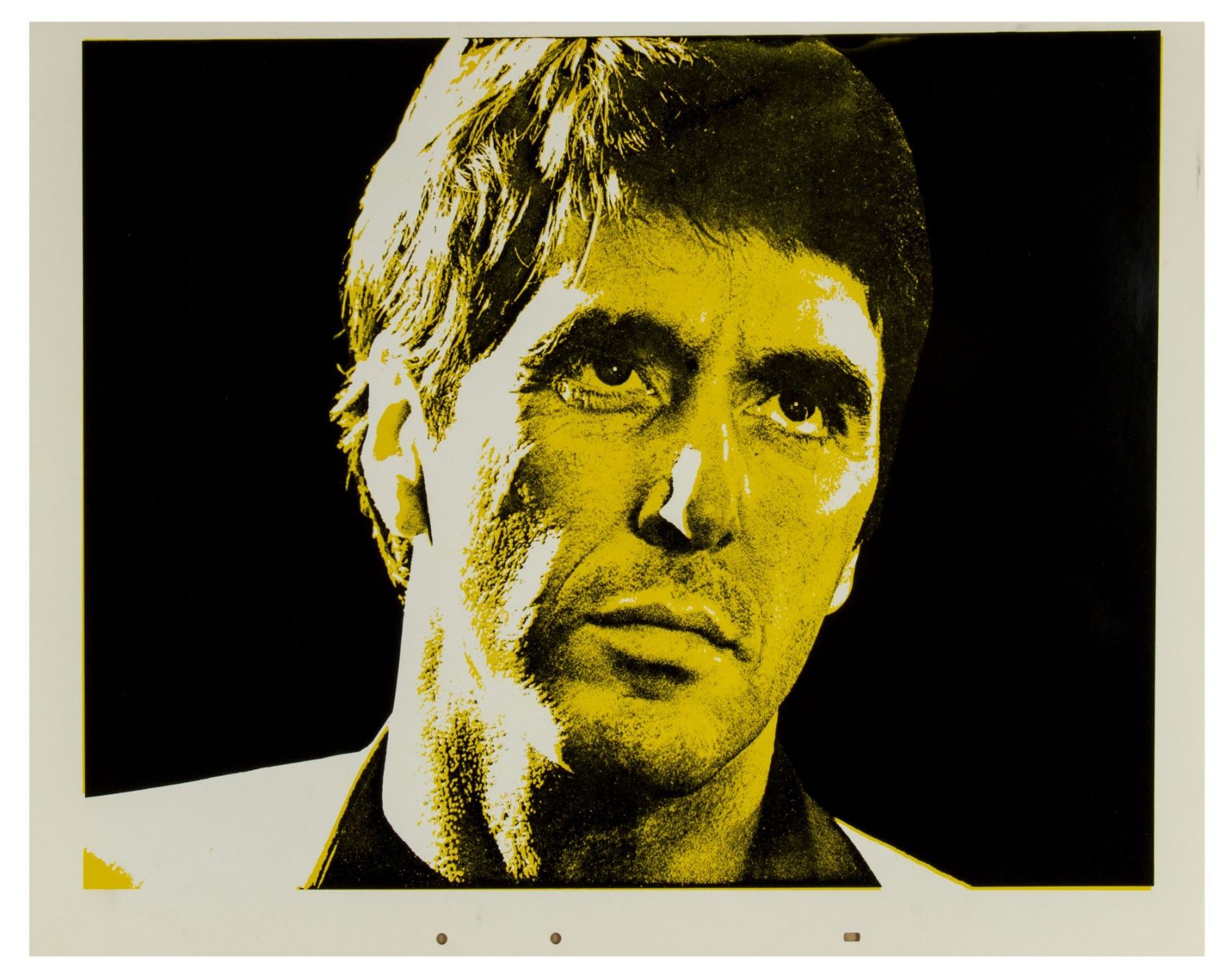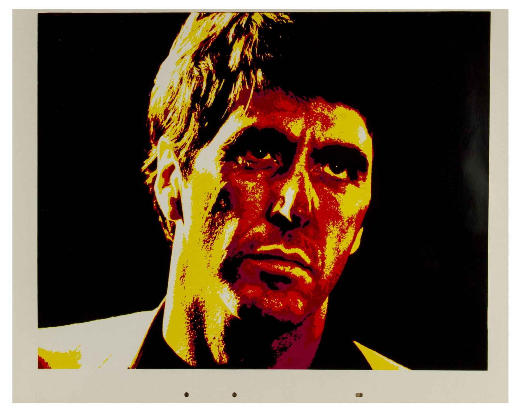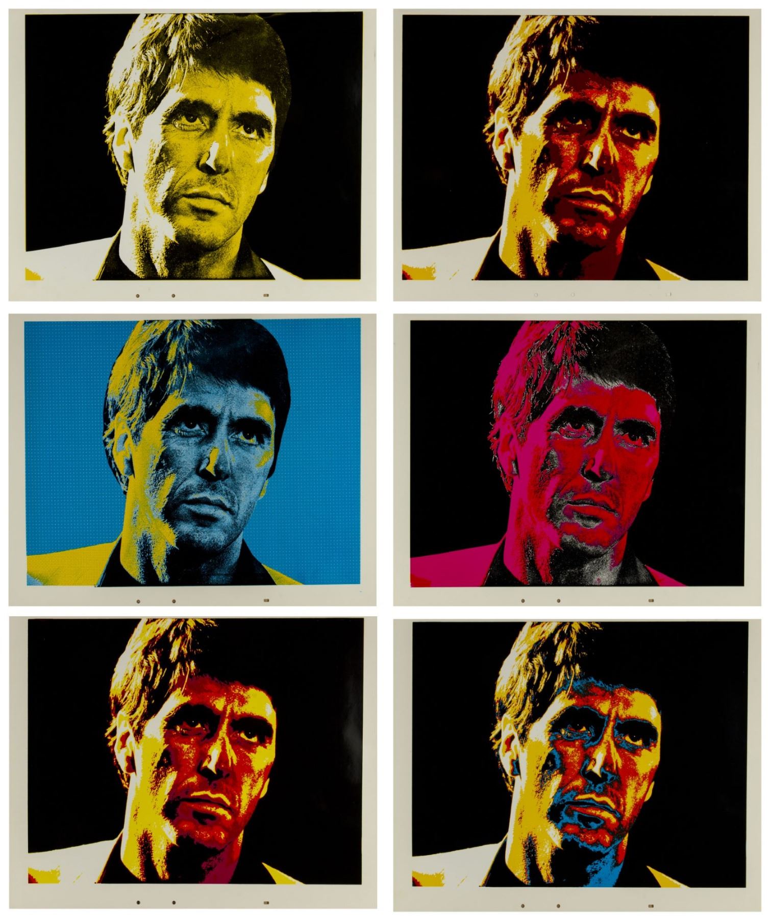 (Universal, 1983) A set of (6) large silkscreened prints featuring Al Pachino in his iconic role of Tony Montana in "Scarface". From the collection of Bill Wallen, these (6) high-quality silkscreened prints feature different color variants of the same image and were used in the creation of promotional materials for the film. Each print measures 20"x26" and the set is in overall very good condition with some minor wear throughout, including some bends in a few corners, some scuffs within the white margins, and some surface-wear. Each of these images are suitable for framing, as unique pop-art style versions of this iconic film character.