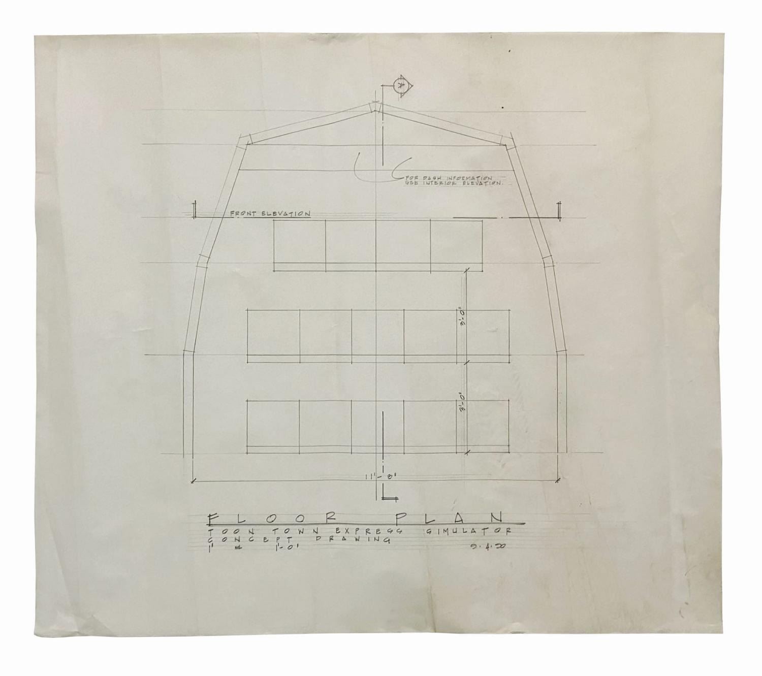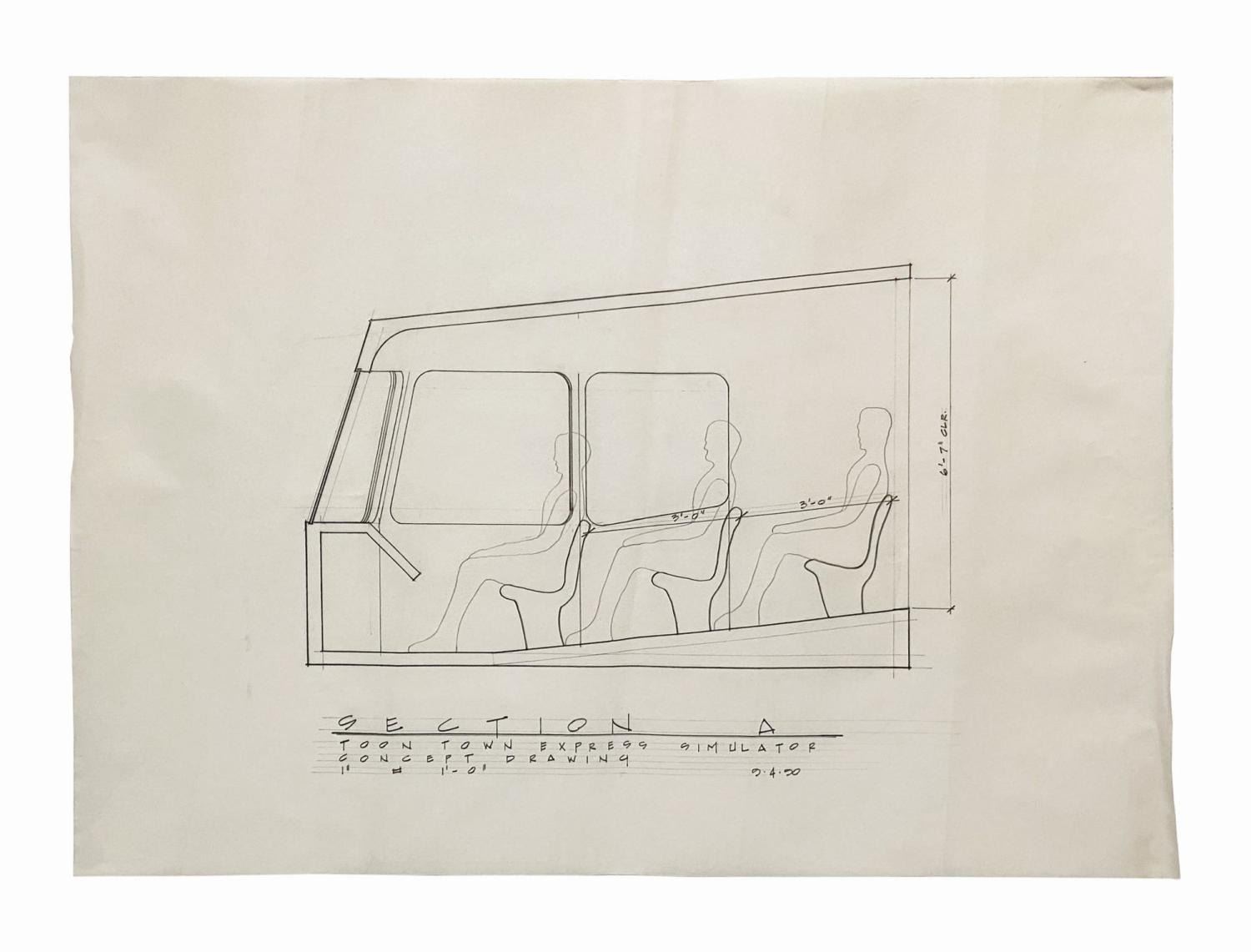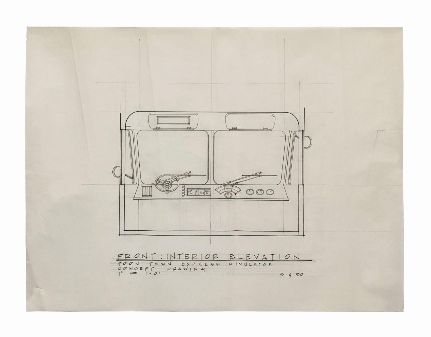 (Disney-MGM, 1990) A set of (6) original concept and architectural drawings for the unrealized Toon Town Express attraction for a Roger Rabbit-themed expansion. Conceived as a suite of multimedia simulators akin to Star Tours, the Toon Town Express was to be housed in the Toon Town Depot. Accomplished in pencil and marker on vellum and onionskin paper, the drawings depict an elevation and a cross section of an individual simulator car, as well as floorplans of the simulator complex. Unfortunately, during development, Disney and Amblin Entertainment entered a dispute over rights to the character and the project was never completed. These rare original drawings are some of the few surviving artifacts of what might have been. Ranging in size from 16"x21.25" to 18"x26.5", the drawings are in good to very good condition with some creasing, wrinkling, tiny tears, and other handling wear typical of the medium.