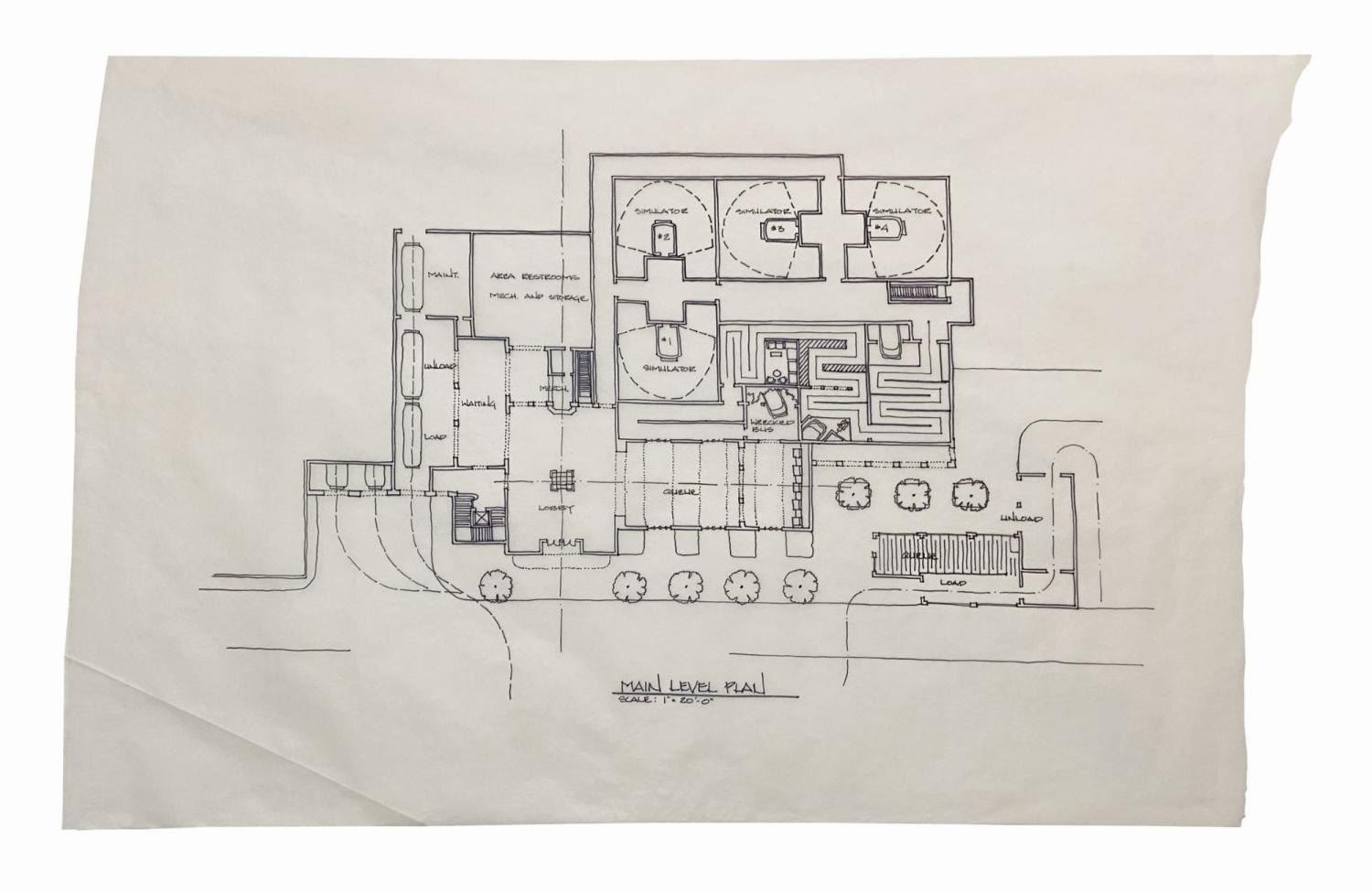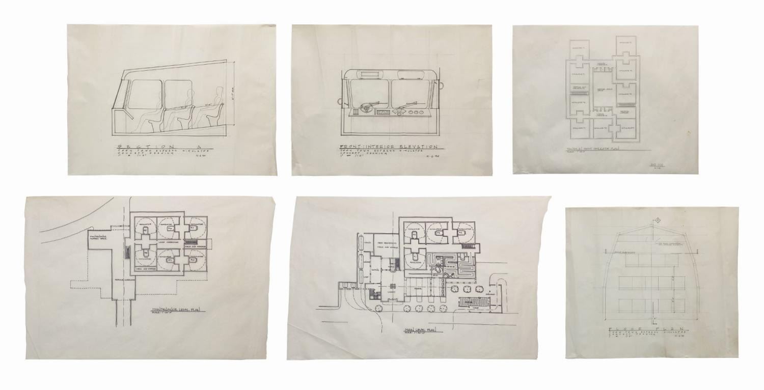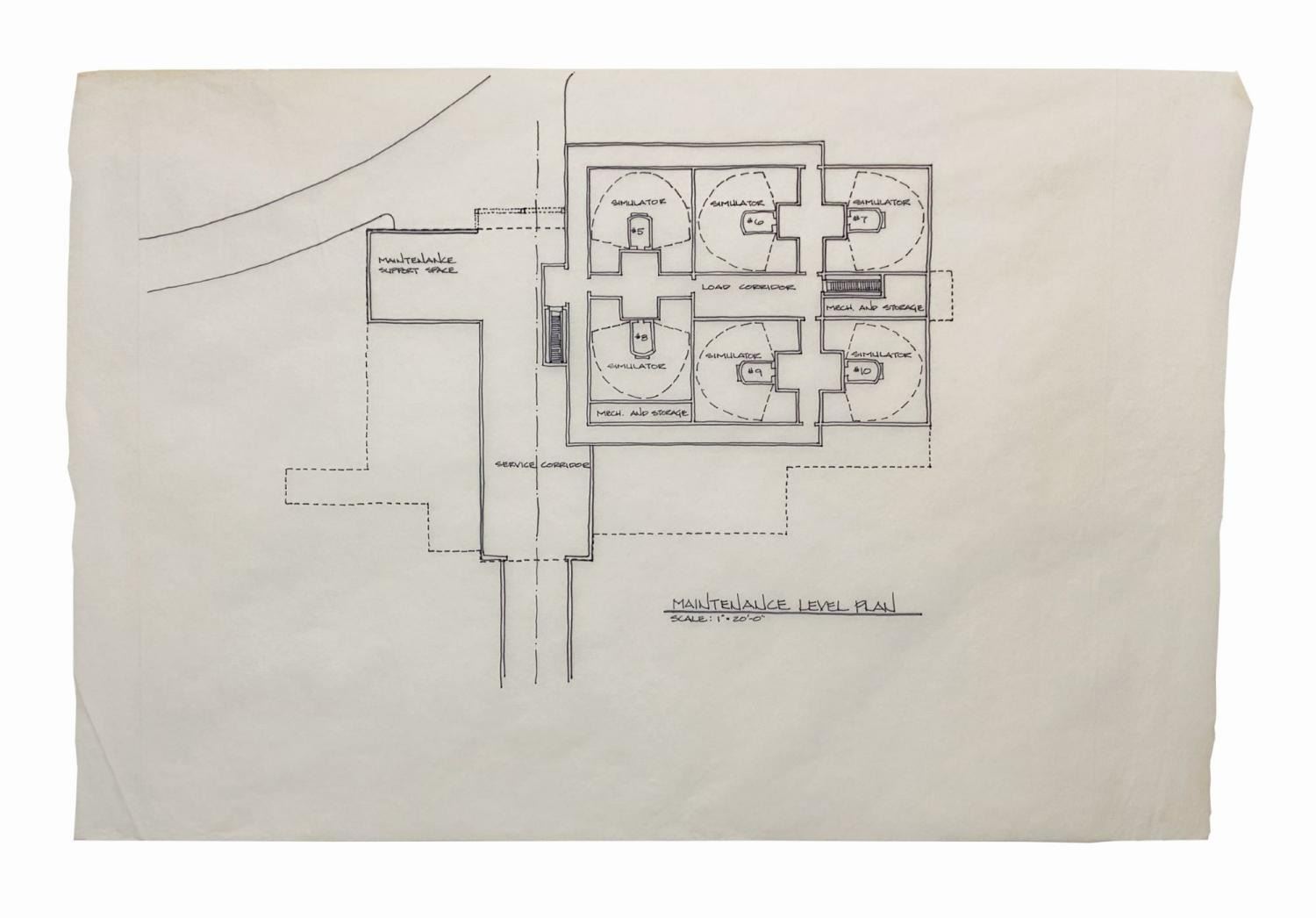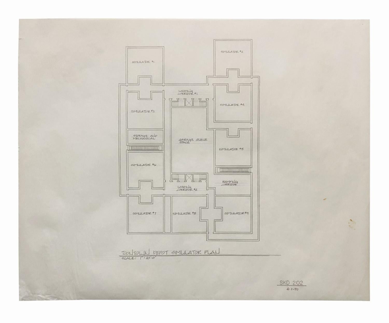 (Disney-MGM, 1990) A set of (6) original concept and architectural drawings for the unrealized Toon Town Express attraction for a Roger Rabbit-themed expansion. Conceived as a suite of multimedia simulators akin to Star Tours, the Toon Town Express was to be housed in the Toon Town Depot. Accomplished in pencil and marker on vellum and onionskin paper, the drawings depict an elevation and a cross section of an individual simulator car, as well as floorplans of the simulator complex. Unfortunately, during development, Disney and Amblin Entertainment entered a dispute over rights to the character and the project was never completed. These rare original drawings are some of the few surviving artifacts of what might have been. Ranging in size from 16"x21.25" to 18"x26.5", the drawings are in good to very good condition with some creasing, wrinkling, tiny tears, and other handling wear typical of the medium.
