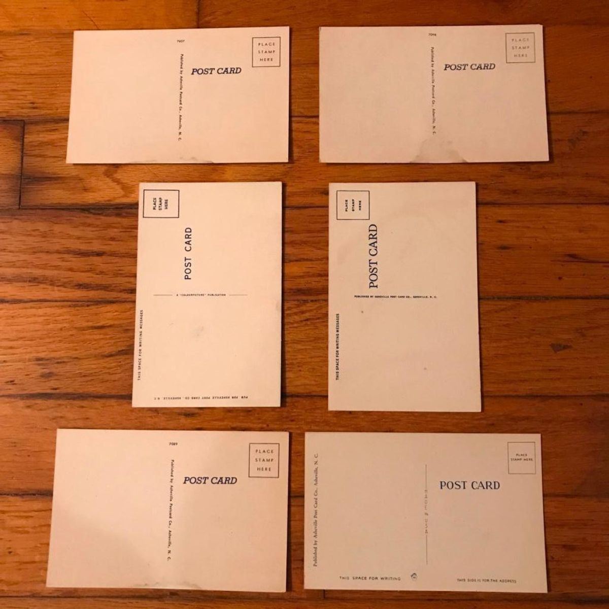 Set of 6 vintage linen postcards, circa early 1900's depicting camping, travel, mountain scenes - lakes, rivers & streams. Published by the Asheville Postcard Company. * some discoloration at the bottom edge of one card.