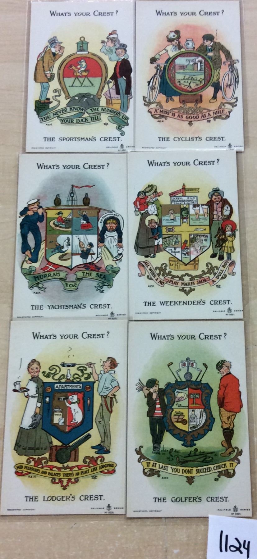 Set of 6 & Wrapper Humor Postcards "What's Your Crest"