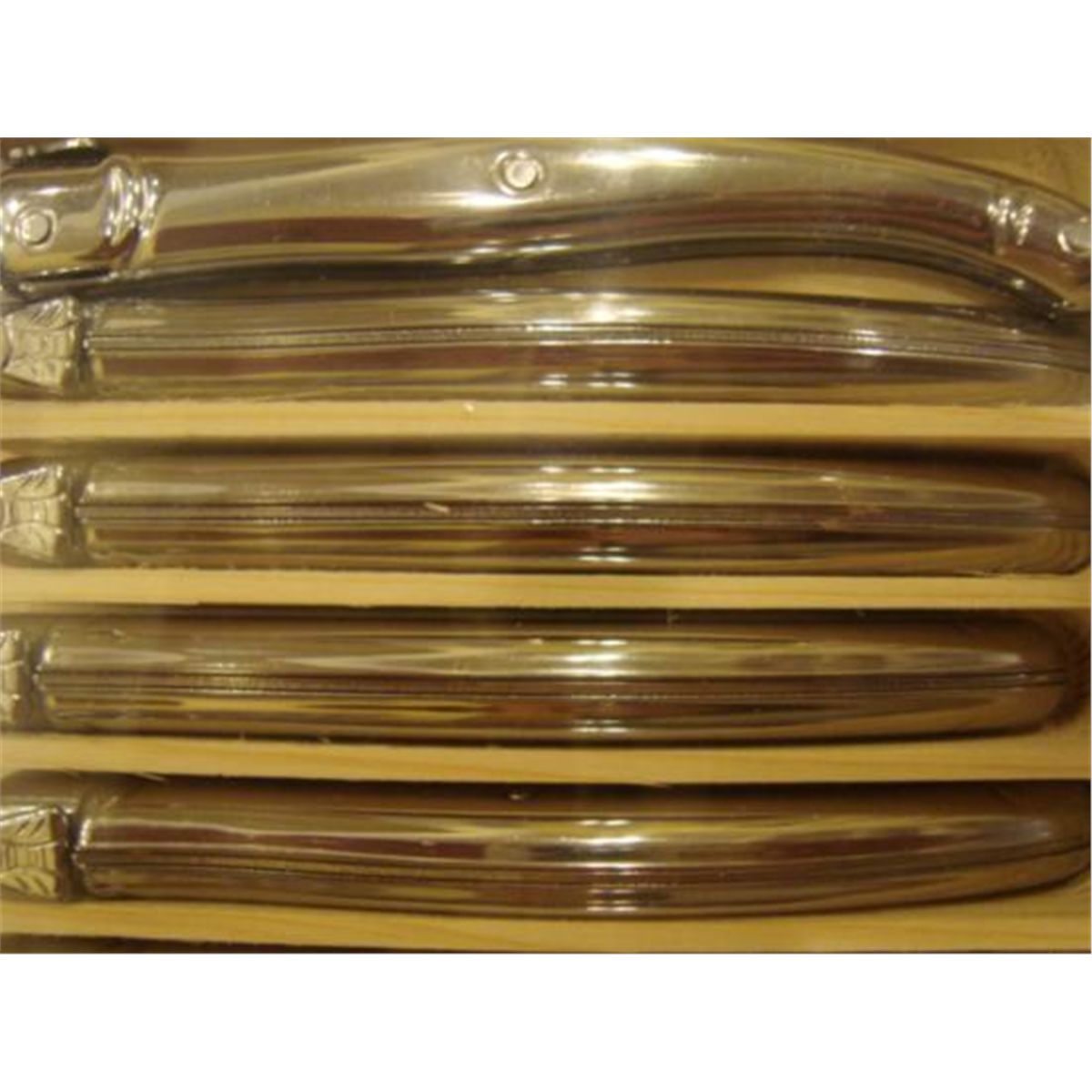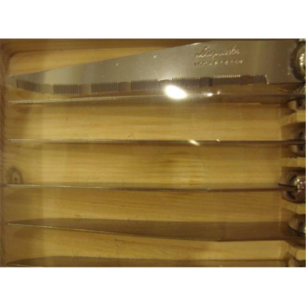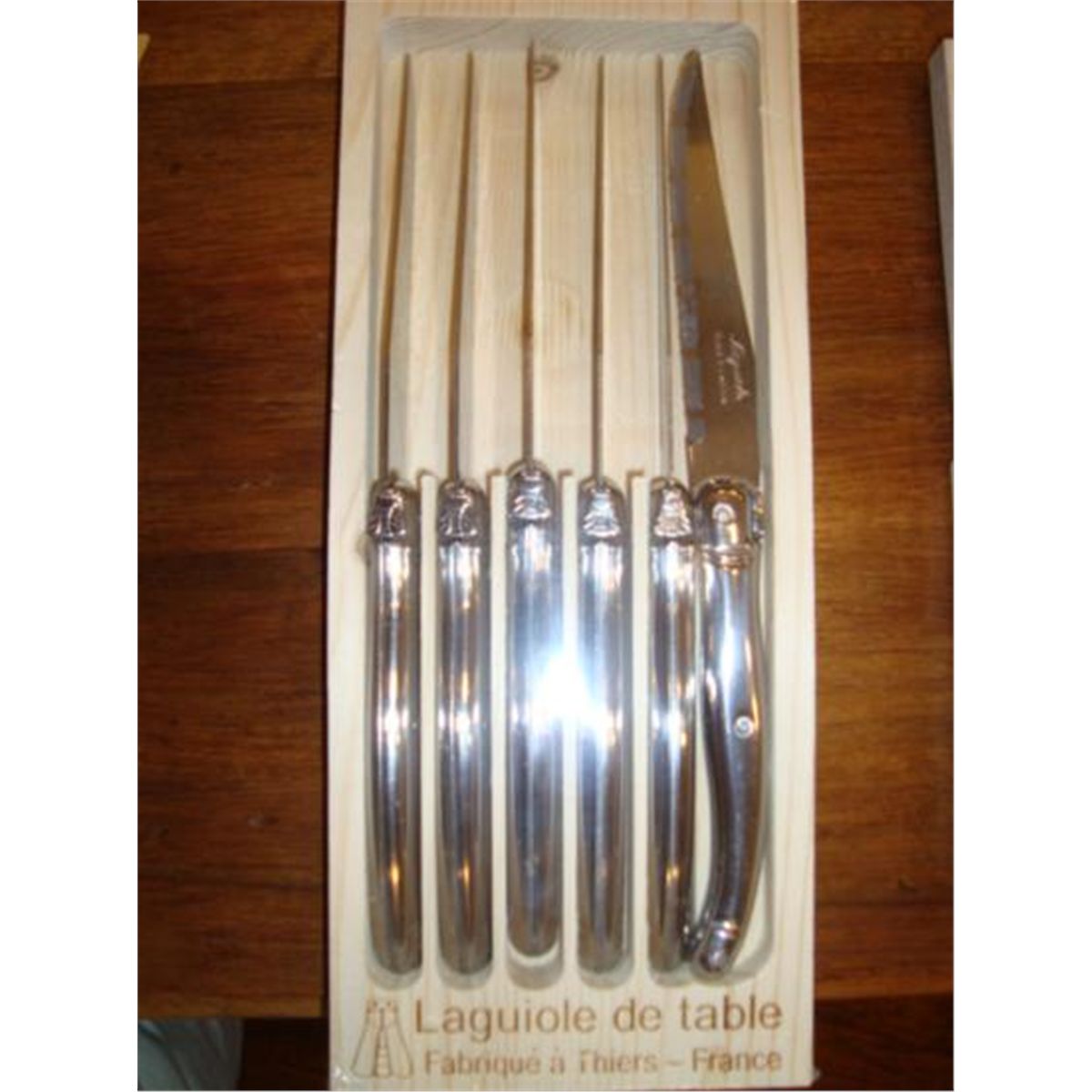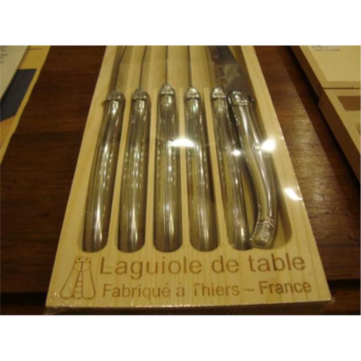 Set of 6 French Laguiole steak knives with stainless steel handles designed by Jean Dubost with its "Authenticity Certificate". DUBOST COLAS PRADEL was created in 1920, by Pierre DUBOST and his wife Marcelle COLAS PRADEL.Dubost Colas Pradel is situated in Viscomtat, a mountain village 15km from Thiers, the capital of french cutlery.Ever since its foundation in 1920 by Pierre Dubost and his wife Marcelle Colas Pradel, the company has passed down a family tradition of fine workmanship and high quality products.It is now in the hands of the third (Philippe Dubost) and the fourth (Alexandre Dubost) generations.The company has grown in notoriety due to being attentive to the changing needs of consumers, and its faithful presence at international fairs since 1962.Since its creation Dubost Colas Pradel has been in a perpetual development.Despite having started in a small workshop, production grew rapidly under the inspiration of Jean Dubost, the founder's son, who gave his name to the famous flatware line and the world renowned kitchen knives.Quality is an integral part of the company policy.Products are quality controlled at each step of production, with care to assure good workmanship, in order to provide consumers with pleasure and the assurance of long lasting use.Ref #97600