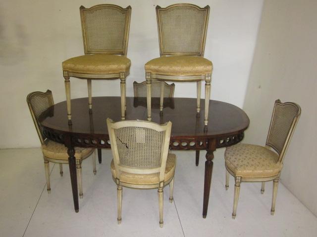 Chairs are mid century, off white & gold, caning as is on two. Table is rosewood banded with 2-15" leaves, approx. 44" D x 72" W, needs refinishing.