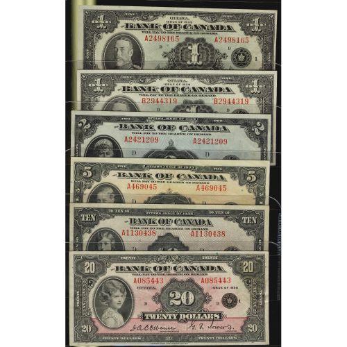 Set of 6 notes with check letter series 'D' 1935 $1 through $20. Includes BC-1 Letter A, BC-1 Letter B, BC-3, BC-5, BC-7, BC-9b small seal. Grades vary from VF to EF+. A lovely and affordable set.