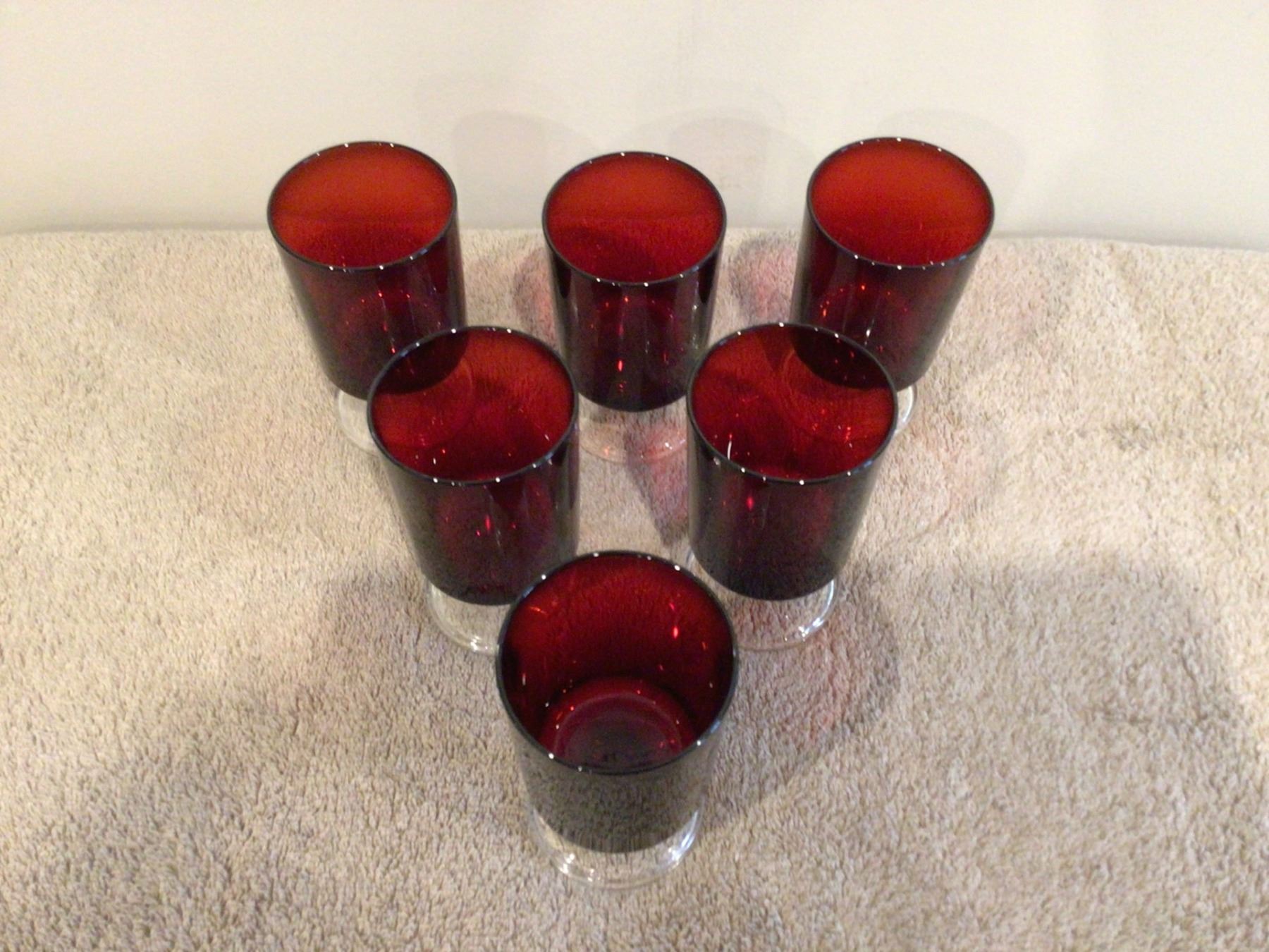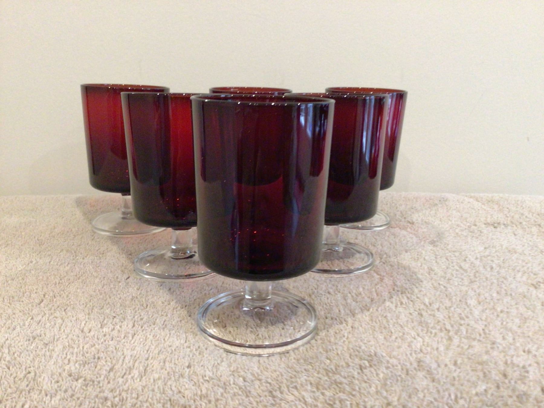 Set of 6 vintage Arcoroc France ruby red pedestal drinking glasses. 4 1/2" tall.