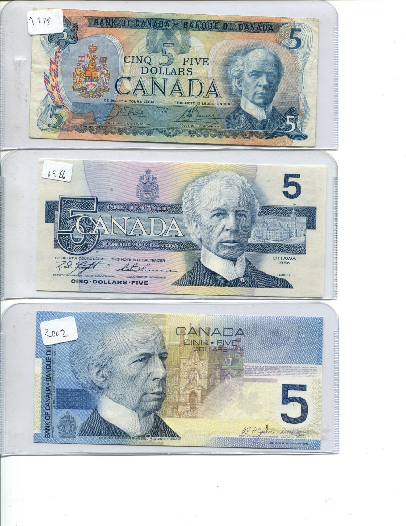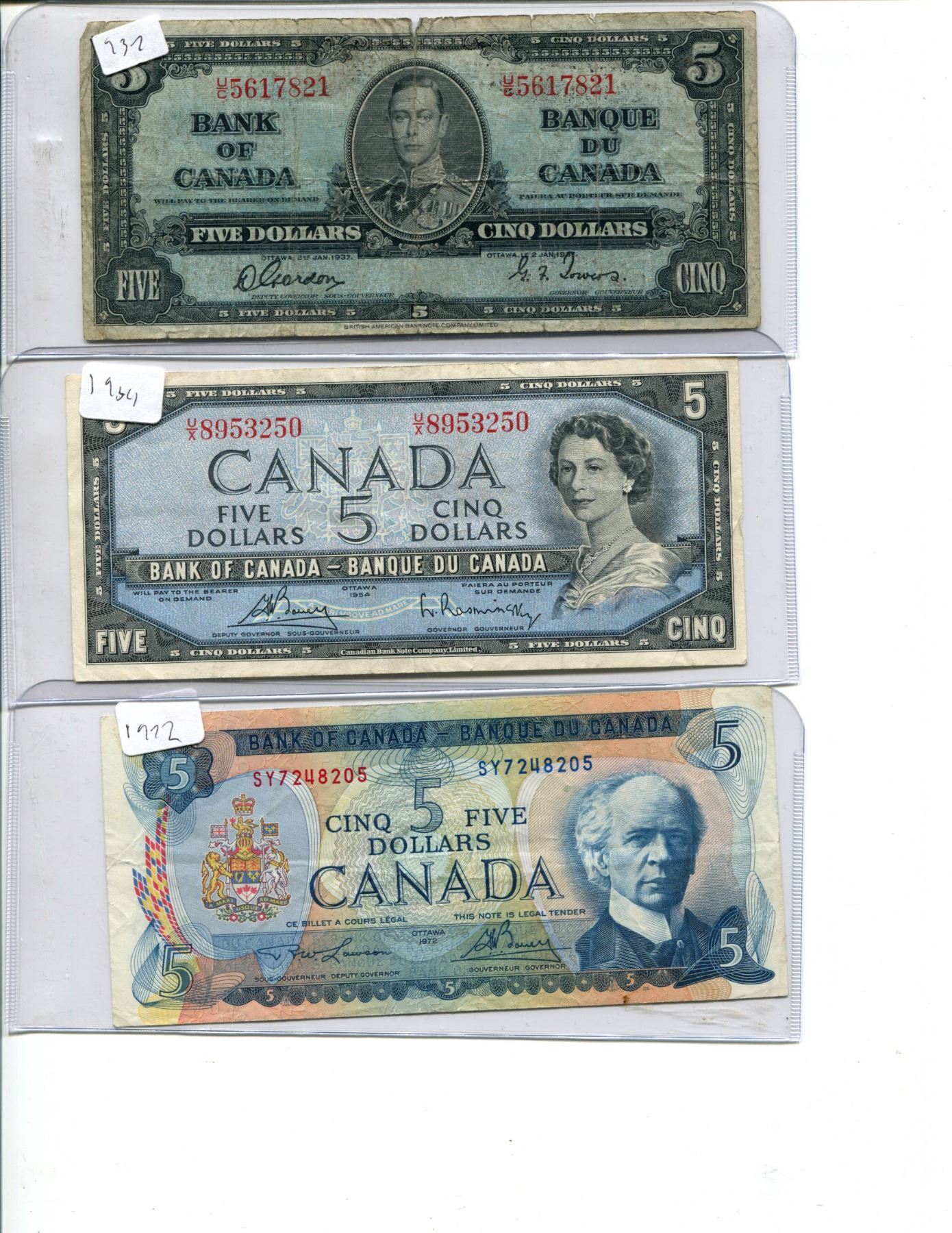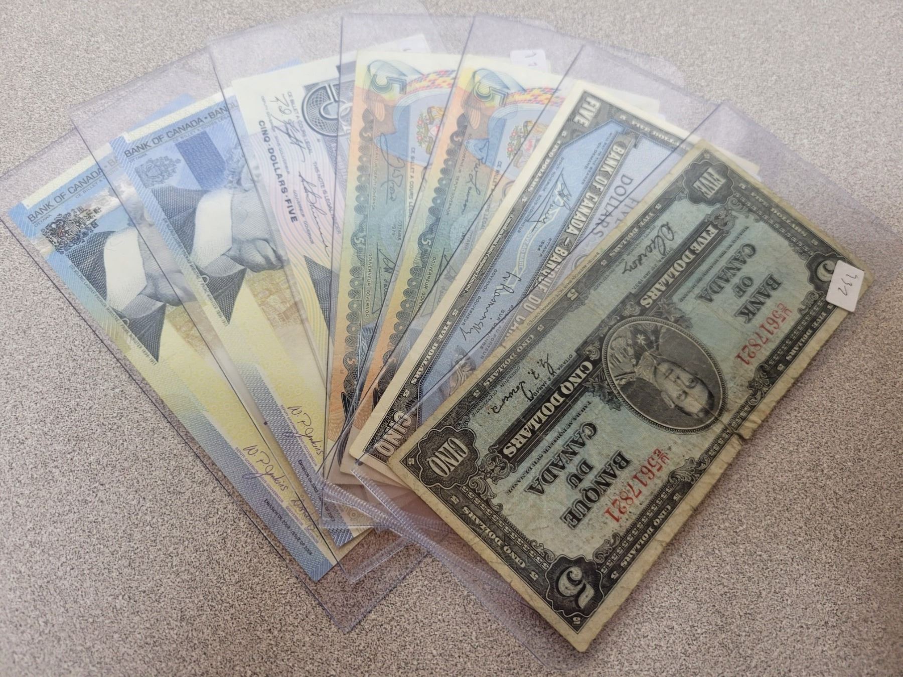 Set of (7) Canadian Five Dollar Bills (Years: 1937, 1954, 1972, 1979, 1986, 2002, 2006)