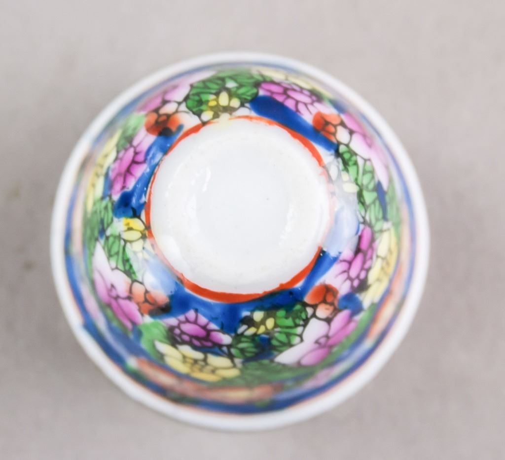 Chinese porcelain tea set. Of 7 pieces; plate, tea pot, tea caddy,a nd four cups. "MADE IN CHINA" stamped on base of tea pot and plate. 8 x 20 cm (box dimensions). 596 grams (including box).