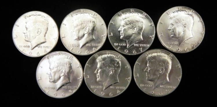 Offered is a complete set of (7) choice BU Kennedy Silver Halves from 1964-1969 P+D. These are outstanding choice uncirculated coins.