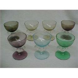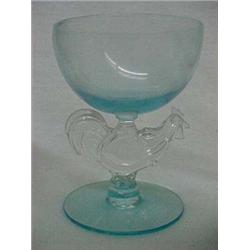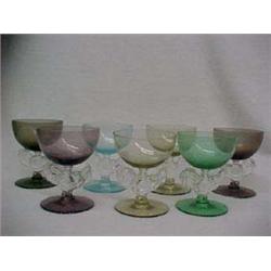 Set of seven colored stemglasses in various colors, each with colored round bowl, clear rooster shaped stems, on round colored bases, one with rim chip, Morgantown, West Virginia
