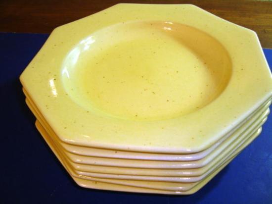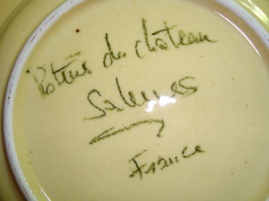 Here is a wonderful set of 7 French plates made by a famous potter (Lamerand) from the village of Salernes (famous for the quality of the pottery made in this part of Southern France) in Provence. These plates were hand-made by Mr Lamerand. He also made his own color with natural materials. Each piece is signed by the artist "Poterie du Chateau, Salernes, France". We also have a set of salade plates and a set of coffee cups. We ship from Texas, not from France. 9.75" diameter
