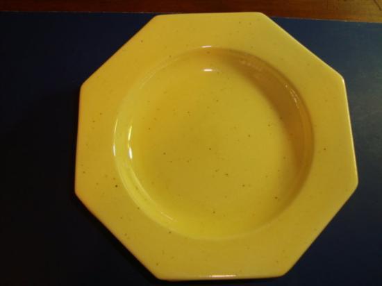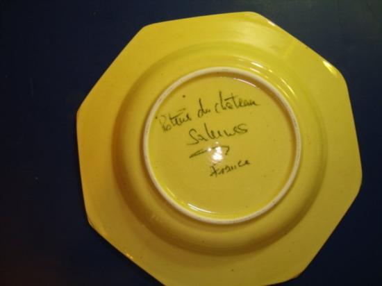 Here is a wonderful set of 7 French plates made by a famous potter (Lamerand) from the village of Salernes (famous for the quality of the pottery made in this part of Southern France) in Provence. These plates were hand-made by Mr Lamerand. He also made his own color with natural materials. Each piece is signed by the artist "Poterie du Chateau, Salernes, France". We also have a set of salade plates and a set of coffee cups. We ship from Texas, not from France. 9.75" diameter