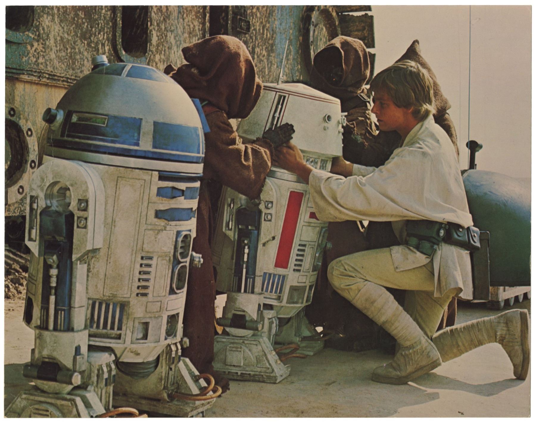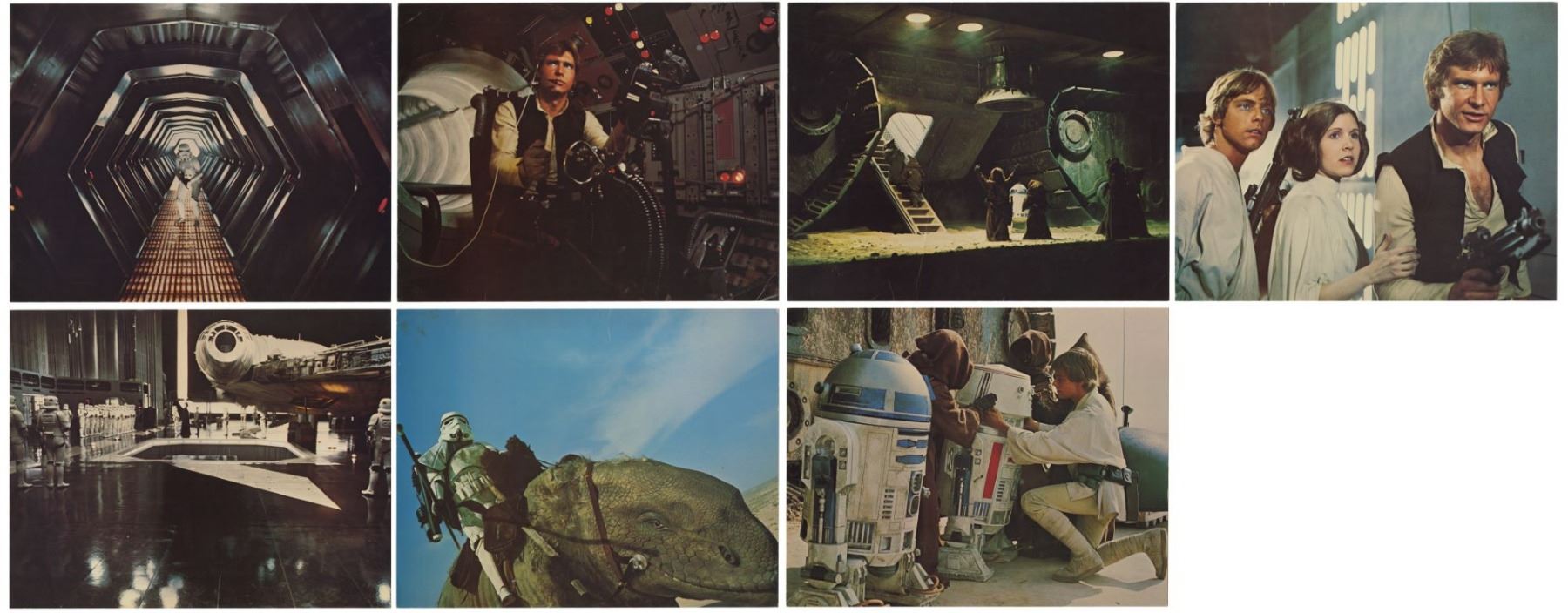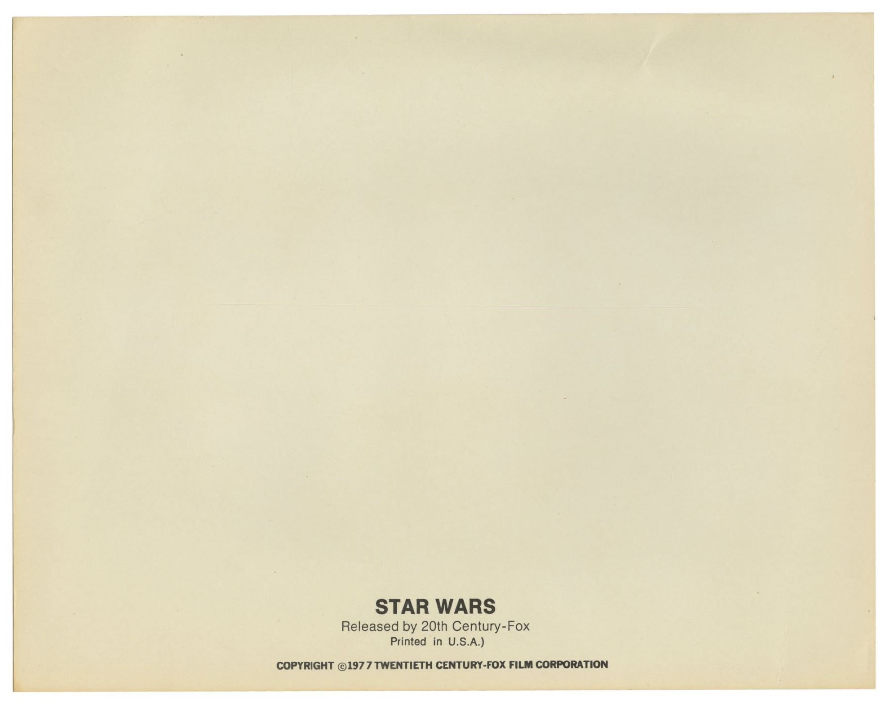 (20th Century Fox, 1977) A very rare set of (7) "borderless" lobby cards created for the original theatrical release of "Star Wars". These lobby cards lack the National Screen Service information seen on the more common cards, and these lobby cards are believed to have been printed by the Studio rather than by the NSS. The copyright information for the film is listed on the reverse of the cards which allows for larger images on the front. Measuring 11"x14", these lobby cards are in good condition with some creases and small scratches throughout from use, yellowing to the back sides from age, and some edge wear. The image of R2D2 and the sandpeople has the most yellowing on the back side.